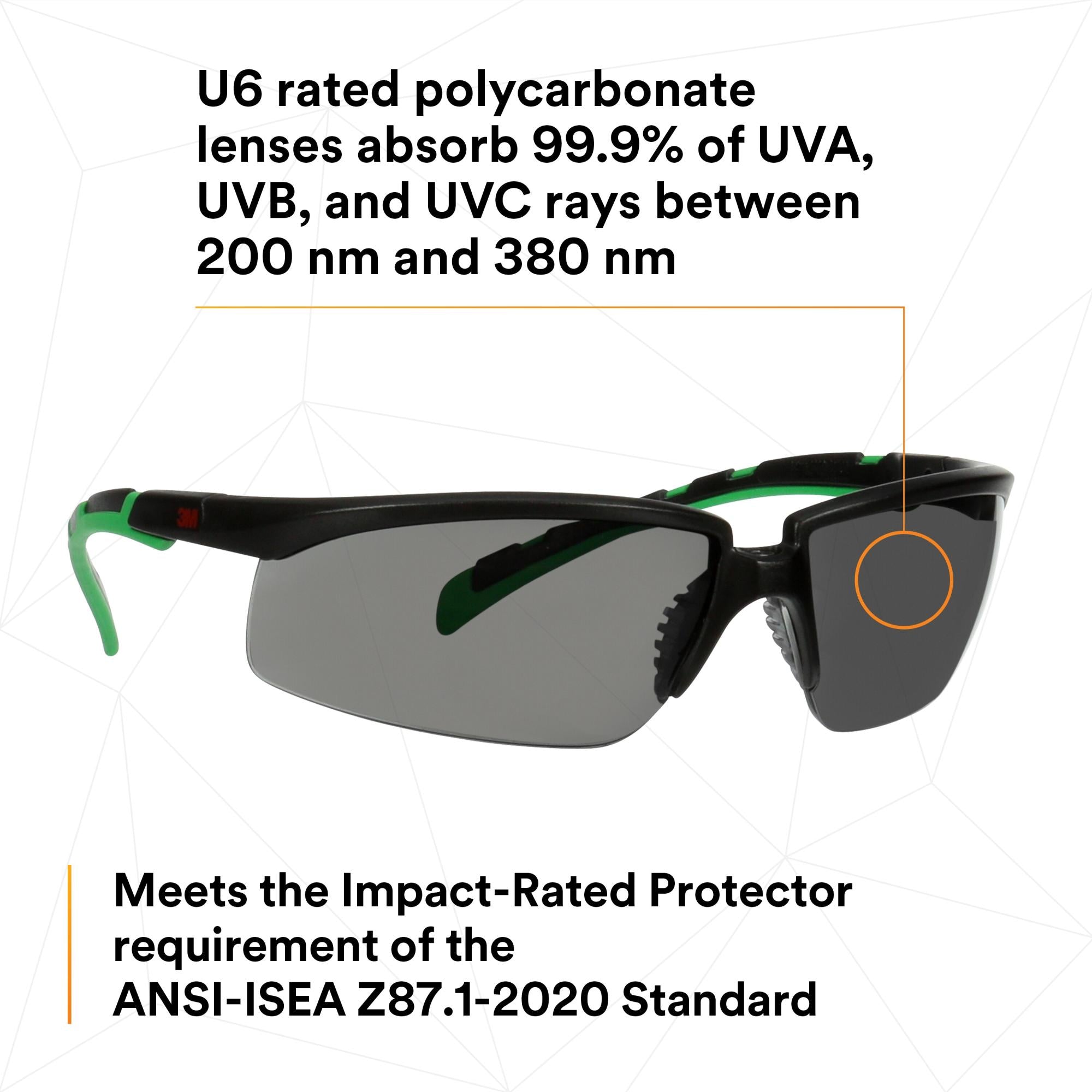 • U6 rated polycarbonate lenses absorb 99.9% of UVA, UVB, and UVC rays between 200 nm and 380 nm