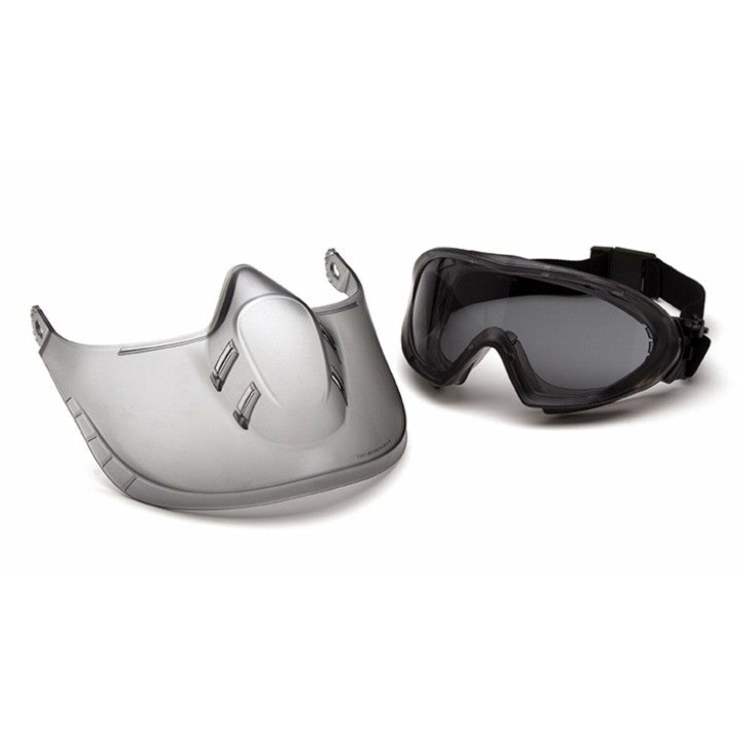 Pyramex- Gray H2X Anti-Fog Lens with Face Shield- Fully adjustable elastic band. - Fits over prescription glasses. Lens is coated to prevent fogging. Soft vinyl goggle body conforms to facial contours. Goggle provides protection against dust and chemical splash. Scratch resistant polycarbonate lens provides 99% UVA/B/C protection. Removable vent caps allow the user to remove when more ventilation is required or leave in place for unsurpassed chemical splash resistance. Goggle incorporated with removable shield provides full face protection. 4 ventilation holes provide appropriate airflow. Ratchet shield allows user to open or close in 3 positions for adjustment. Polycarbonate shield conforms to the face offering increased impact and dust protection.