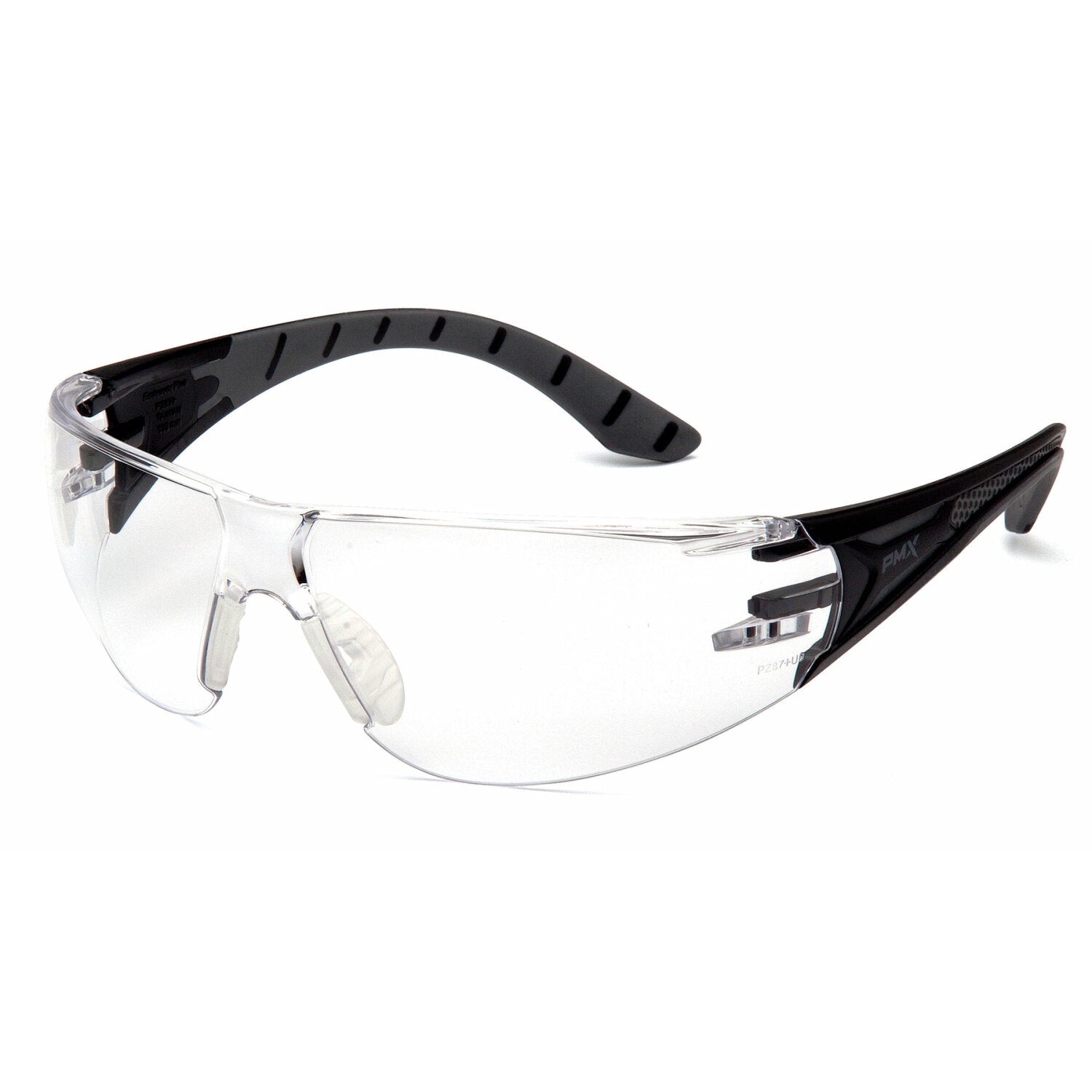 Pyramex - Endeavor Plus - Black-Gray Frame/Clear Lens - Lightweight & durable protective eyewear. Built-in brow guard shields against overhead particles. Special dielectric hinge design contains no metal parts. Curved, co-material temples allow for comfortable all day wear. Scratch resistant polycarbonate lens provides 99% UVA/B/C protection. 9.5 base one-piece wraparound lens provides excellent side protection. Soft and adjustable nose piece provides a customized fit to prevent slippping.