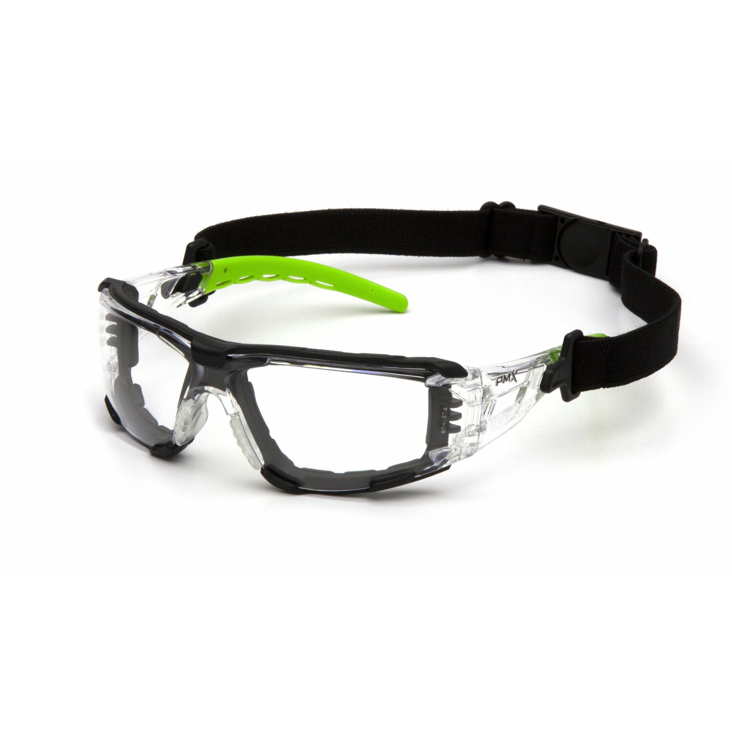 Pyramex-Fyxate-Lime Temples- Clear Lens Foam Pad H2MAX- Flame resistant foam padding - Dielectric - Rubber temple tips and nosepiece - Single wraparound lens - Quick release strap