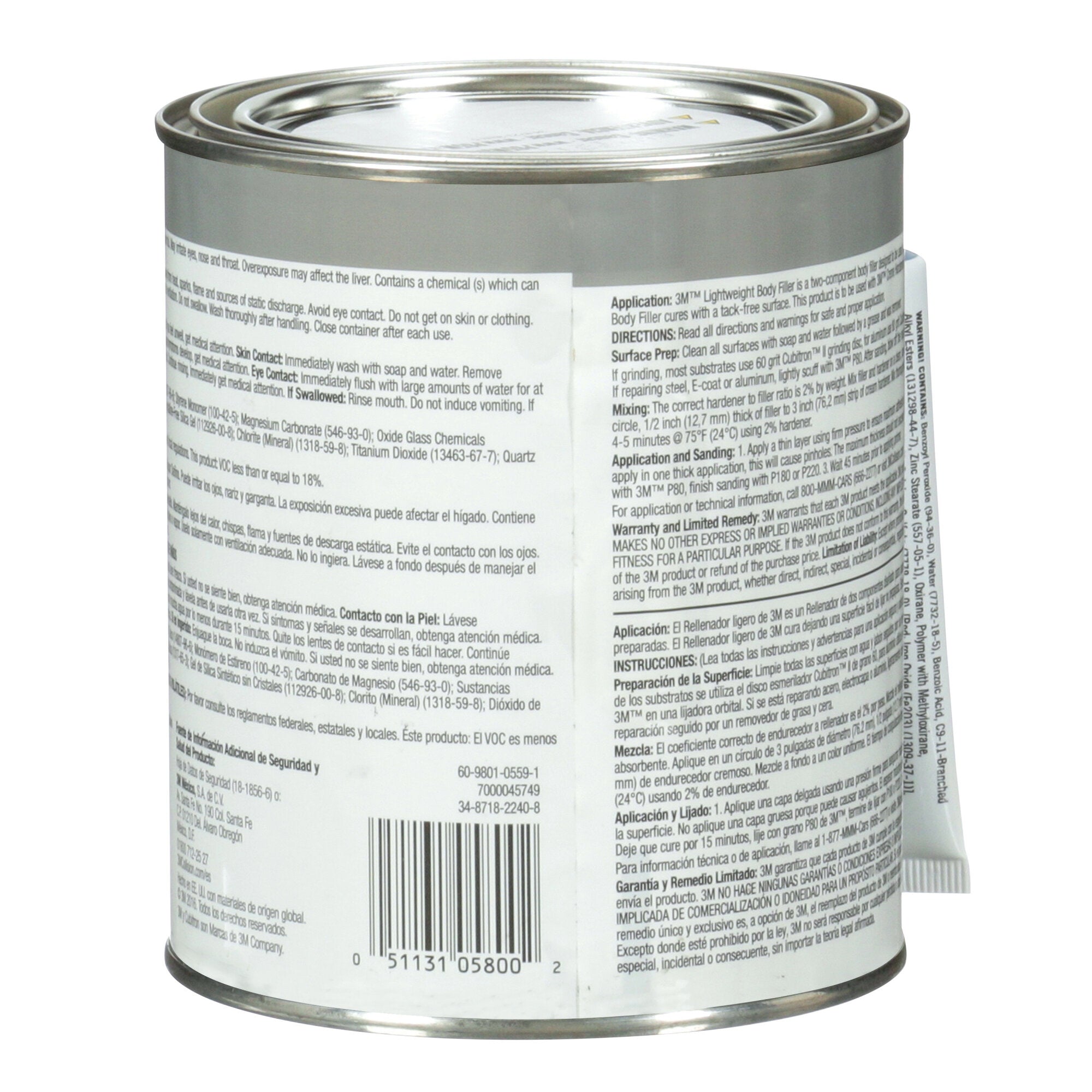 3M™ Lightweight Body Filler comes in a creamy formula that is easy to mix, spread and sand.  Manufactured with only the highest quality ingredients, our auto body filler is vacuum processed to minimize pinholes. The filler cures tack free in 20 minutes with good handling characteristics. It resists loading sandpaper, so sanding is easier and you can use less abrasives. This is a two component product that includes both filler and cream hardener.