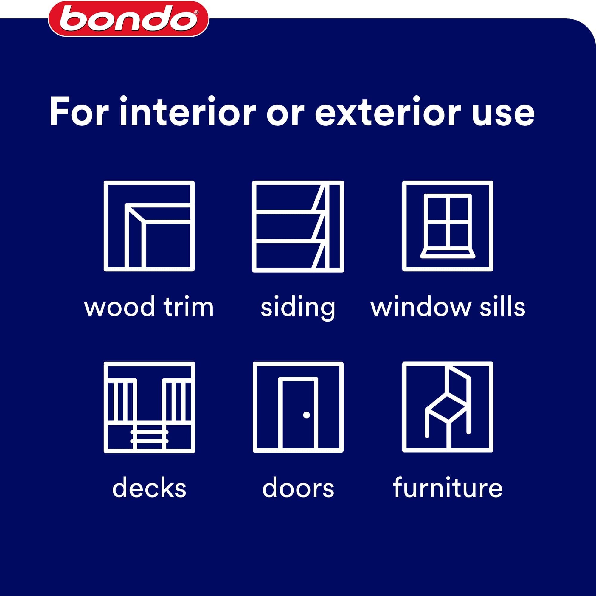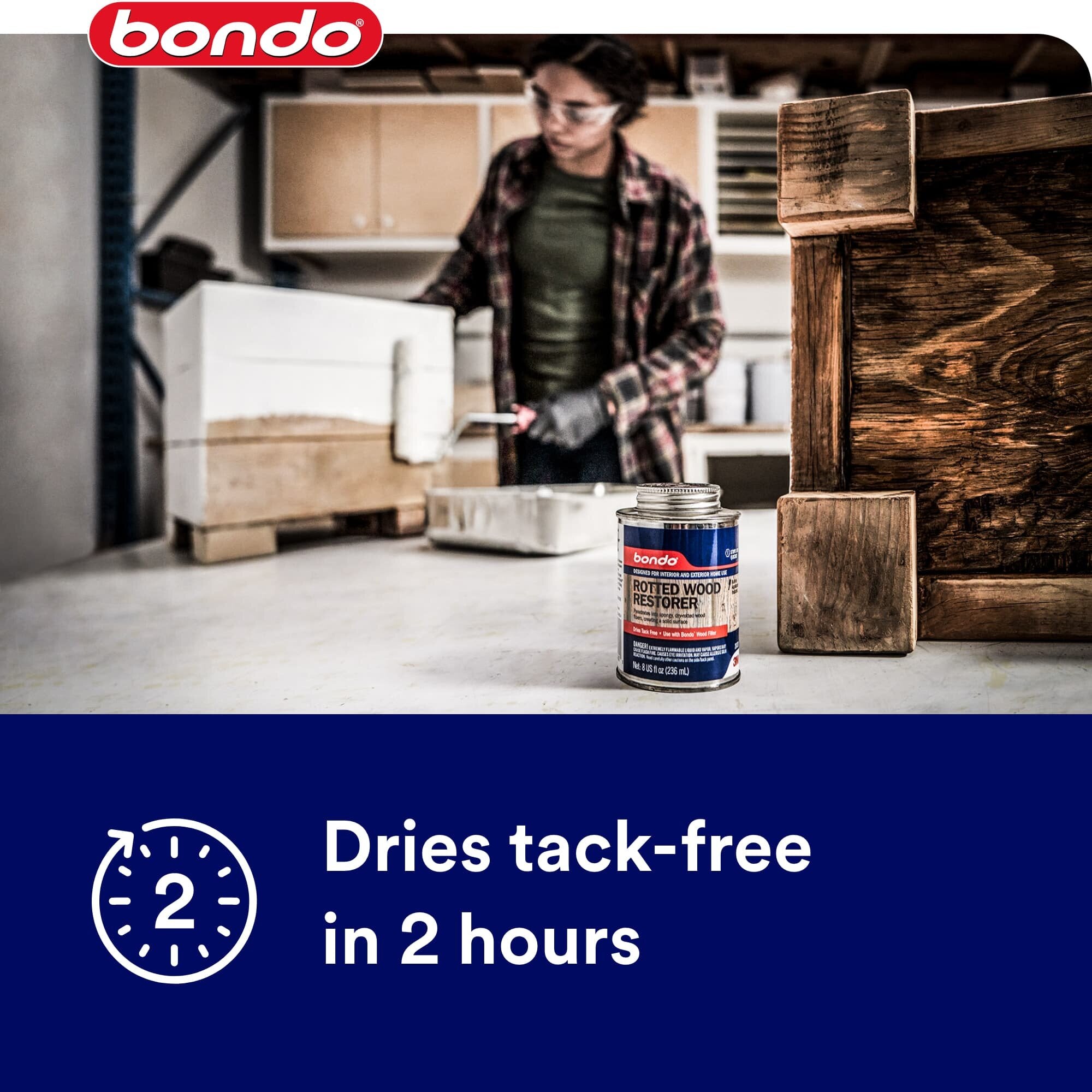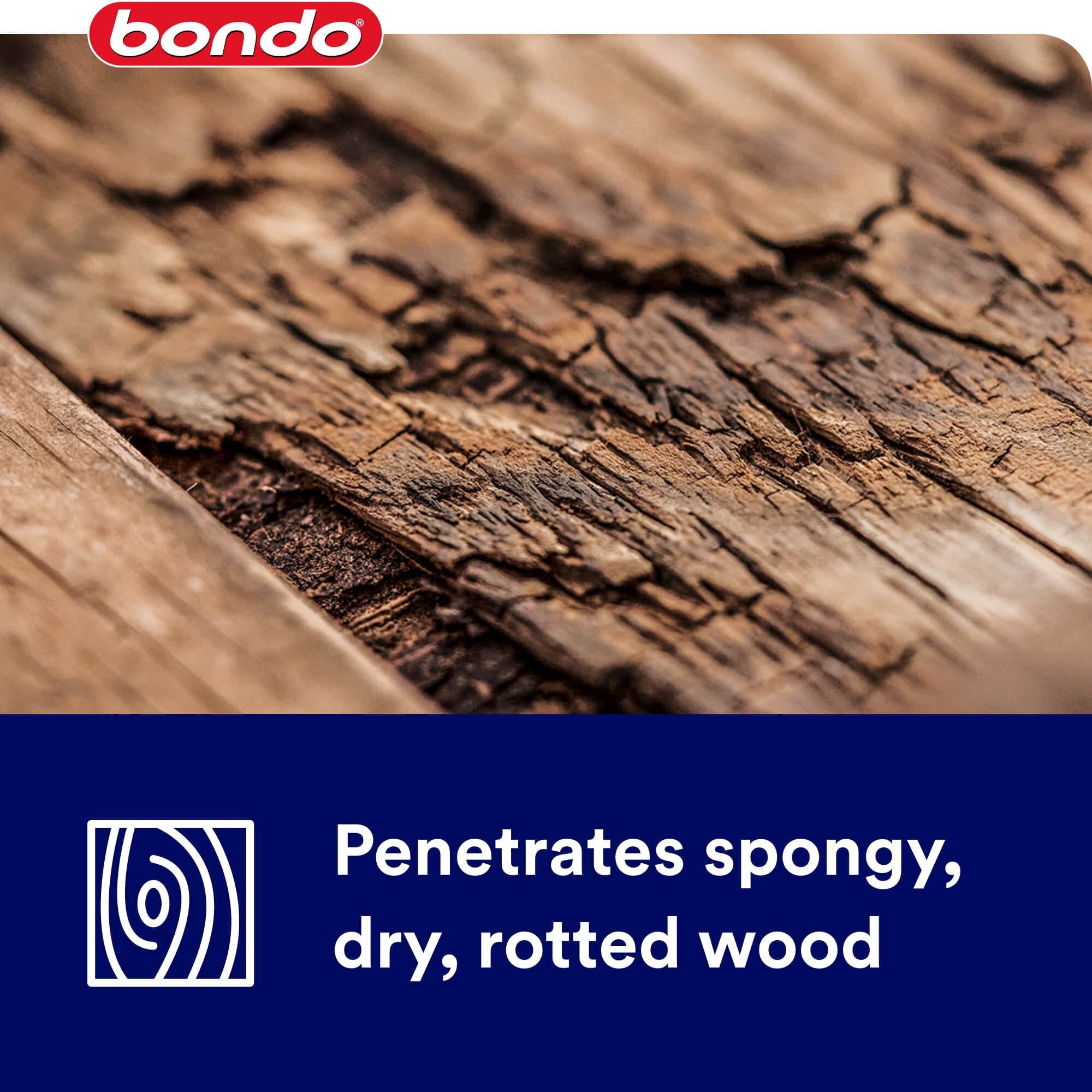 Bondo Rotted Wood Restorer will solidify soft and spongy wood by penetrating into the wood surface to create a solid base and stop rot quickly. Wood rot is a common issue for most homeowners, regardless of where you live. It can be easily repaired with this restoration product. It is excellent for use with Bondo Wood Filler (sold separately).Bondo Rotted Wood Restorer will solidify soft and spongy wood by penetrating into the wood surface to create a solid base and stop rot quickly. Wood rot is a common issue for most homeowners, regardless of where you live. It can be easily repaired with this restoration product. It is excellent for use with Bondo Wood Filler (sold separately).