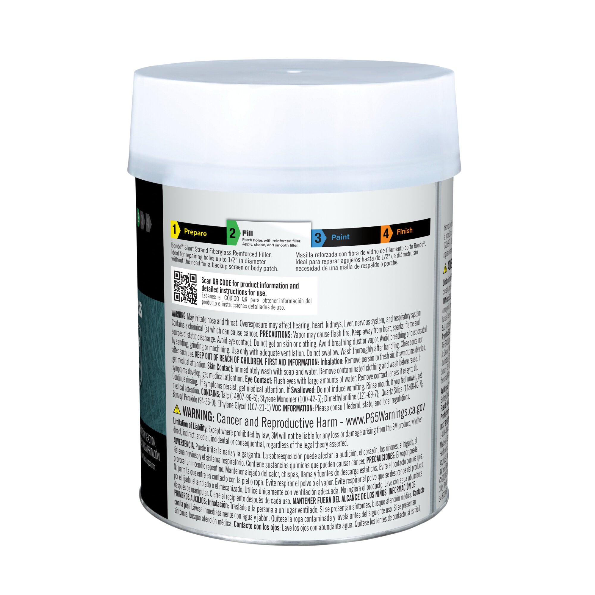 Bondo® Short Strand Fiberglass Reinforced Filler empowers DIYers to tackle the toughest rust repair jobs via the strength of Bondo® fiberglass strands. This thicker formula is stronger than Original body filler, dries fast and works great on vertical surfaces like car doors.Bondo® Short Strand Fiberglass Reinforced Filler makes an excellent foundation for hole and rust-out repairs without the need for backing strips, fiberglass cloth, or mat. It contains short, interlocking fiberglass strands and fibers that make it stronger than regular body filler. It is also slightly thicker and provides a fast drying time, making the filler less messy on vertical surfaces like car doors.