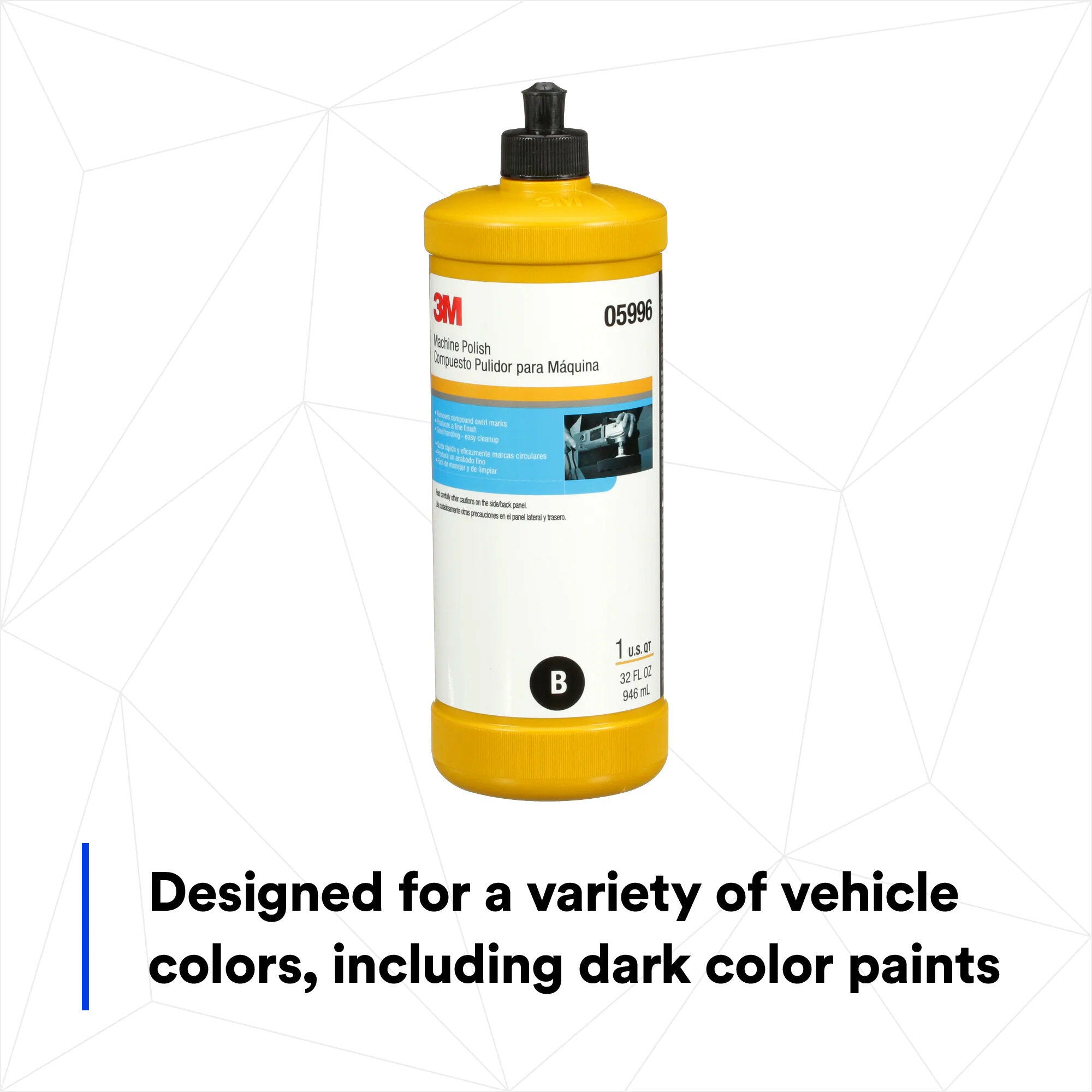 3M Machine Polish effectively removes compound swirl marks and minor surface defects to restore the beauty of automotive finishes. It leaves a swirl-free finish when applied with a 3M Foam Polishing Pad, PN 05725. 3M Machine Polish contains no waxes or silicones. This machine polish quickly removes compound swirl marks even on dark colored vehicles.Removes Tough Swirl Marks