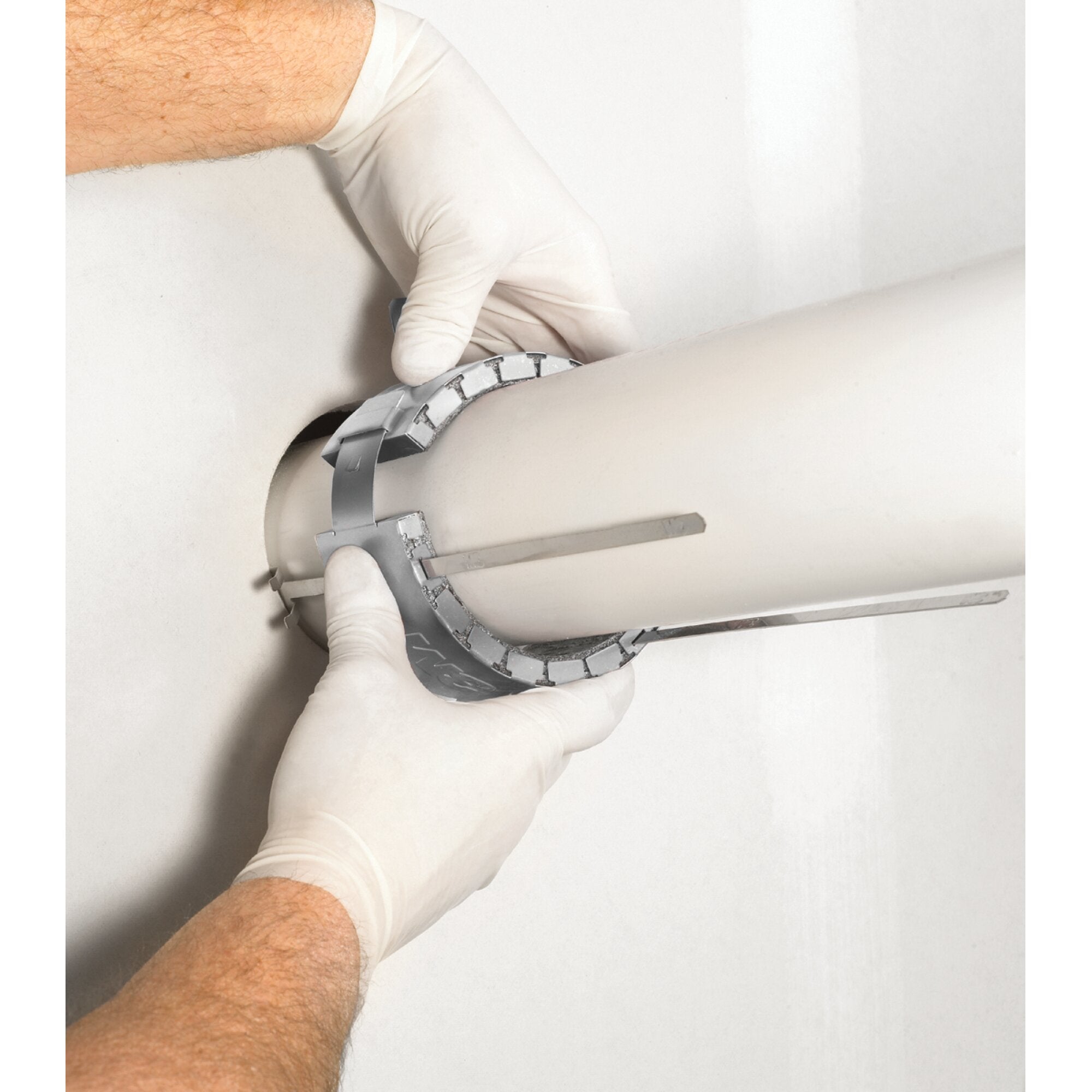 Incorporates our 3M™ Fire Barrier Wrap Strip FS-195+ and is specifically designed to be a firestop for non-metalic, 6” pipe penetrations. This one-piece metal collar is built to fit securely around the firestop wrap strips – no additional assembly is required. Tested for up to 2 hours of fire protection in tested and listed systems, the device holds firestop material in place and helps ensure proper closure during fire. Metal tabs make for fast, easy anchoring to wall or floor slabs with common tools and hardware such as toggle bolts for gypsum or masonry anchors for concrete. (Hardware sold separately.) The result is a permanent, fixed firestop that also contributes to the structural stability of the penetration.