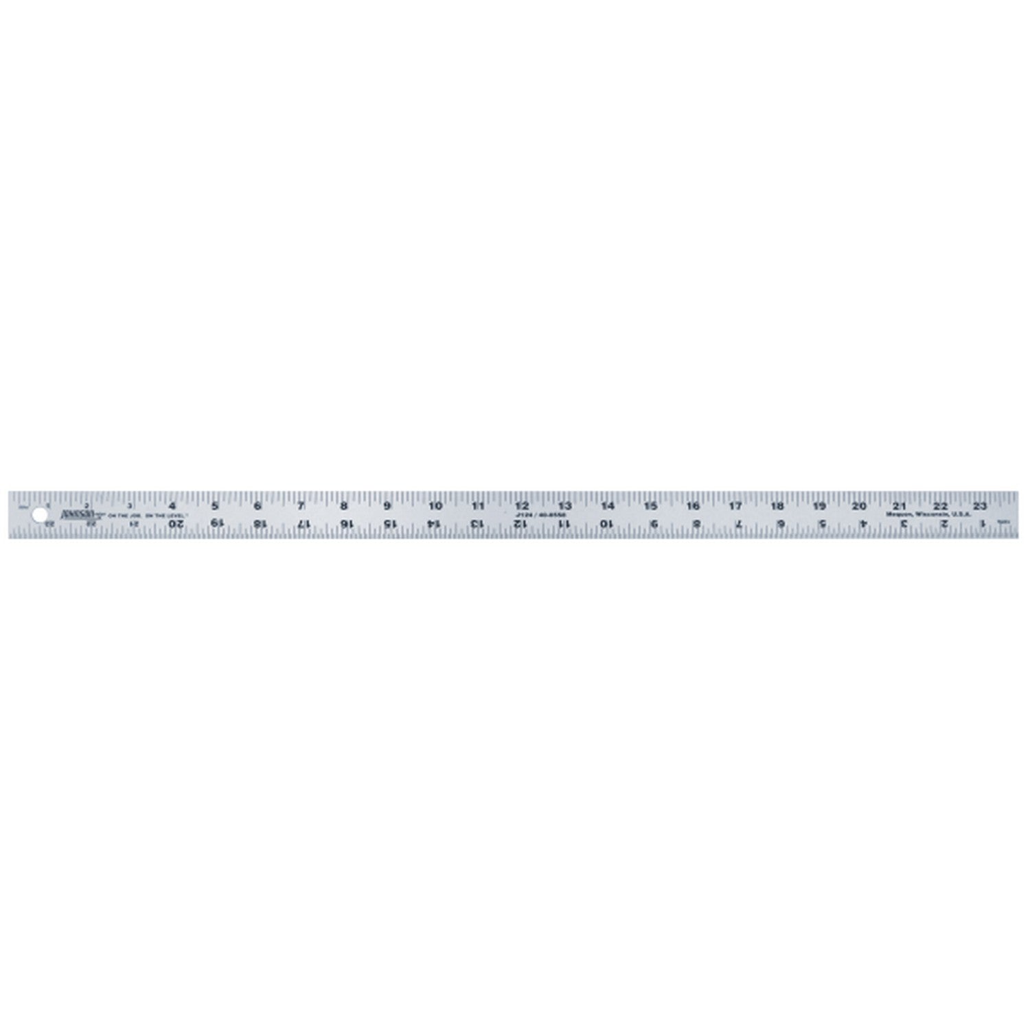 Durable and accurate, Johnson's 24" x 1-1/8" aluminum rule features screened, thermal-bonded graduations in 1/8" and 1/16" that are bold and easy to read. And its clear, protective anodized finish keeps it protected from wear and tear. The rule also features a hanging hole for convenient storage.