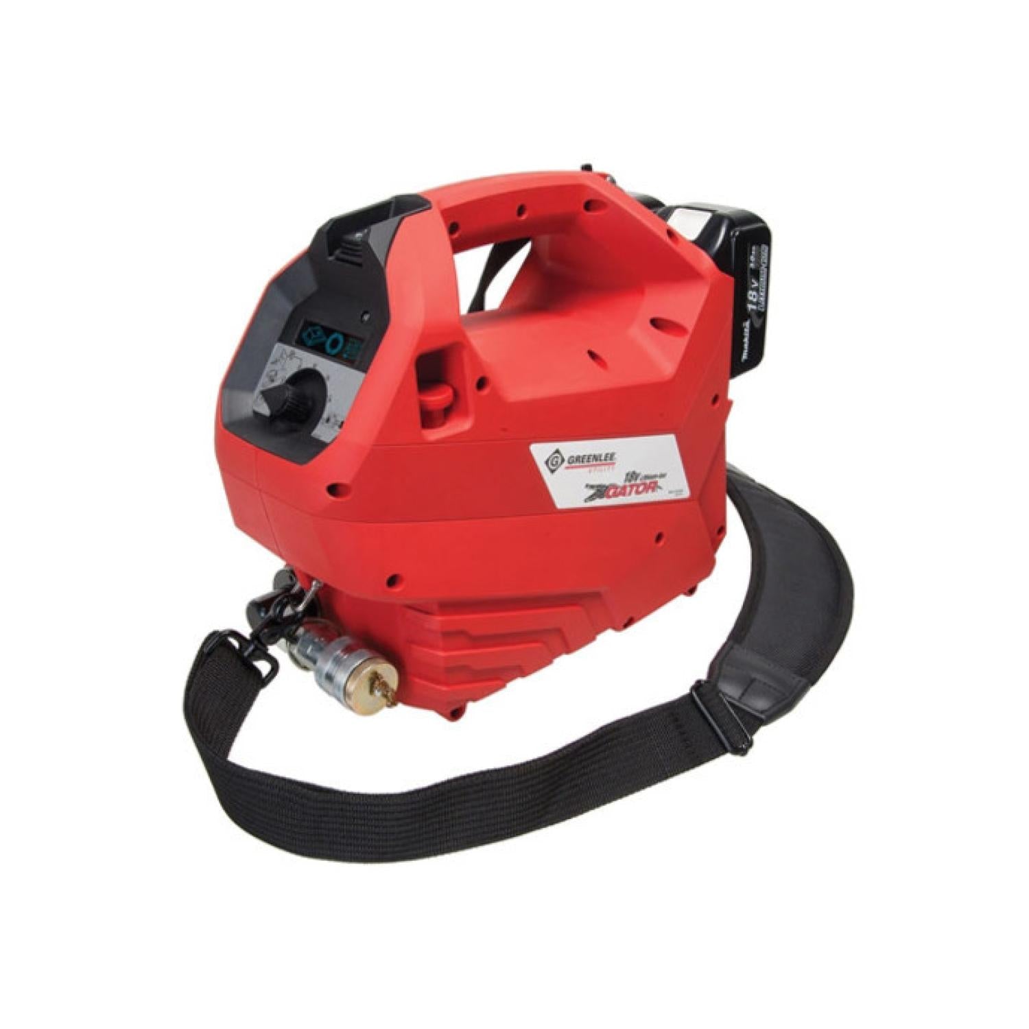 The Greenlee EHP700LUB is a powerful, battery-powered hydraulic pump that is loaded with numerous intelligent features for optimal performance. It includes a multi-function pressure sensor, self-diagnostics, and a real time LED readout. Its mode dial enables the user to select from three program settings – crimp, cut, and punch – and its 18V lithium ion battery provides up to 70% more cycles per charge. The pump also has a manual retraction feature to move the head to its starting position at any time, and a padded shoulder strap for portability.
