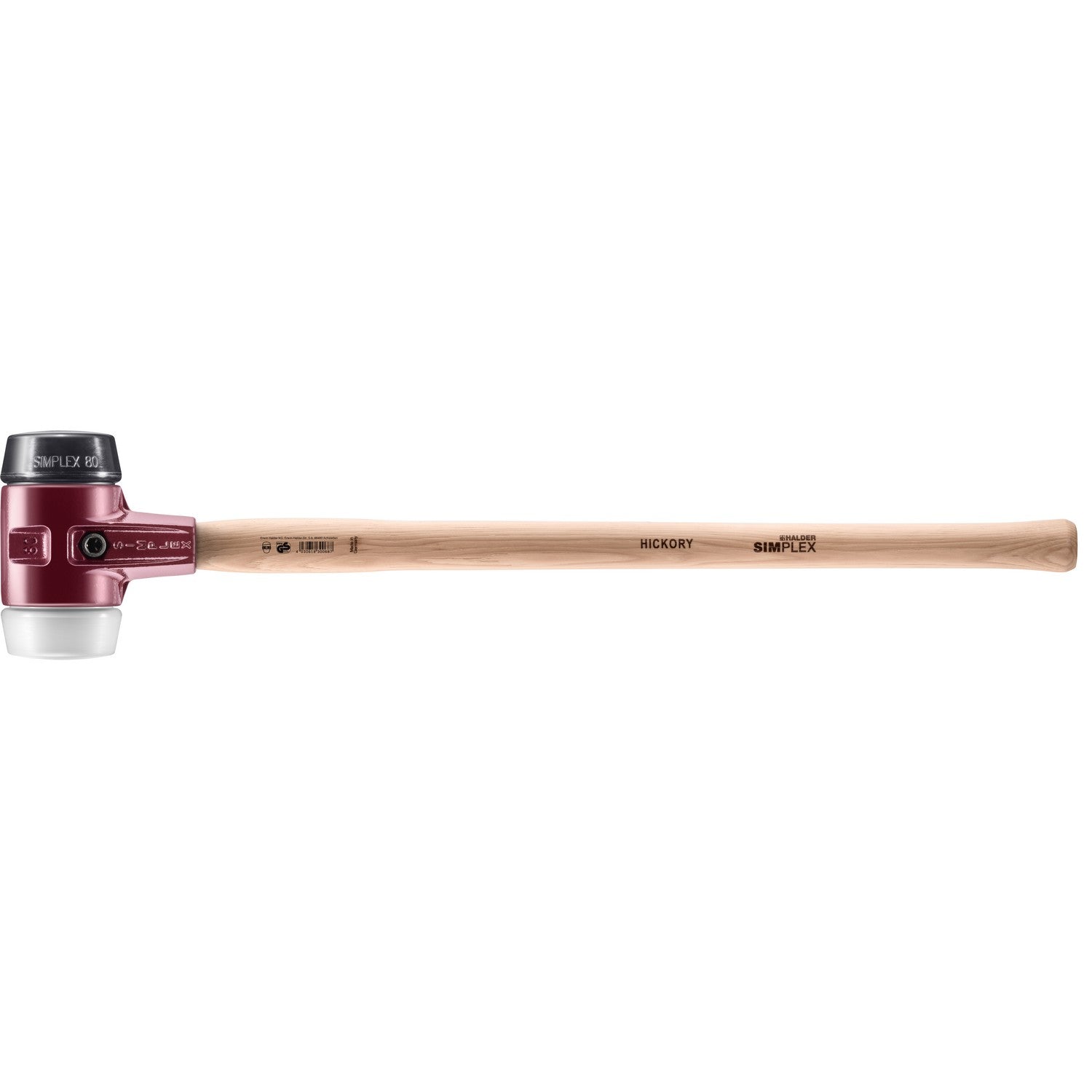 Offering an insert combination of rubber composition / superplastic, the SIMPLEX series 3027 is an indispensable companion for a large number of applications and also available in three sledge hammer versions on account of the fact that it is Halder's top-selling combination: the smallest of these versions boasts a head diameter of D60mm, a total weight of 1,810g, and a total length of 70cm. Another version boasts a head diameter of D80mm, a total weight of 3,170g, and a total length of 80cm (also available as rubber insert with "Stand-Up"). The largest version has a head diameter of D100mm, a total weight of 5,350g, and a total length of 100cm.Ultra low-wear, impact cushioning and odourless, the medium hard rubber insert (series 3202) offers a much longer service life than a conventional rubber hammer.The superplastic insert (series 3207) allows for a more powerful impact force than the rubber insert. It is a medium hard plastic insert made of extruded and extremely homogeneous material. Compared to injection moulded plastic inserts, it is therefore considerably more wear-resistant and durable.Made of cast iron, the housing comes with an integrated handle protection sleeve that provides for a high level of break resistance.The long-fibre and ultra durable hickory handle is varnished and shaped ergonomically.In line with the smart SIMPLEX principle, all components are replaceable and can be retrofitted. This translates to savings in both money and resources.