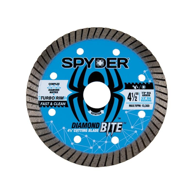 The Spyder Diamond Bite 4-1/2-in Continuous Turbo Rim Diamond Blade is ideal for fast and clean cutting applications including masonry and concrete materials. A high concentration of premium industrial diamonds bonded in a complex diamond matrix yields a blade that cuts cooler -- 3x longer, 30% quicker and cleaner than standard diamond blades. Cut wet or dry for increased versatility using an angle grinder.