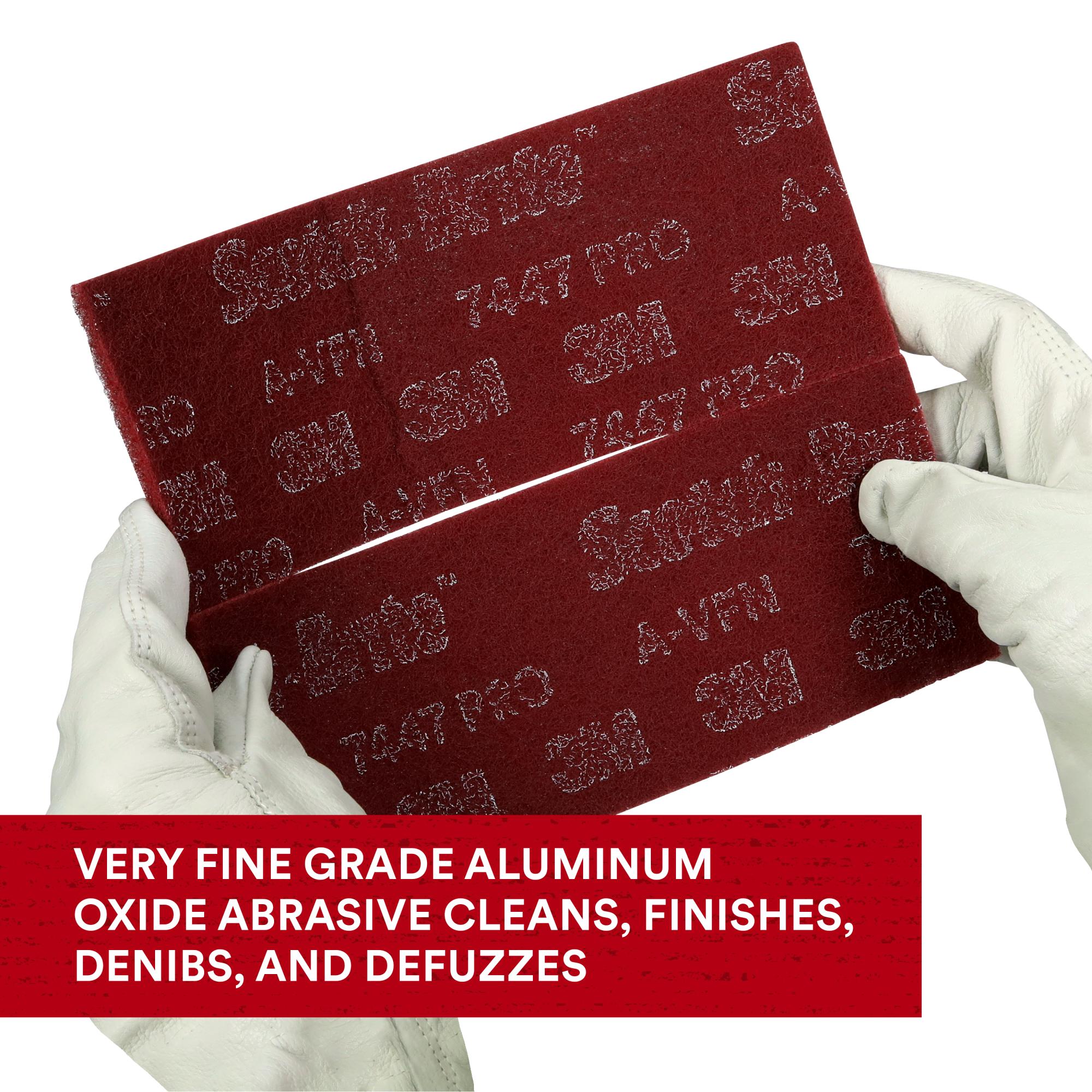 The Scotch-Brite 7447 PRO Sheet Pad combines flexible fibers with outstanding cut to help accomplish tough cleaning jobs or produce fine finishing results, use after use. It is a superior alternative to steel wool, wire brushes, sandpaper and other non-woven products for cleaning or finishing tasks.