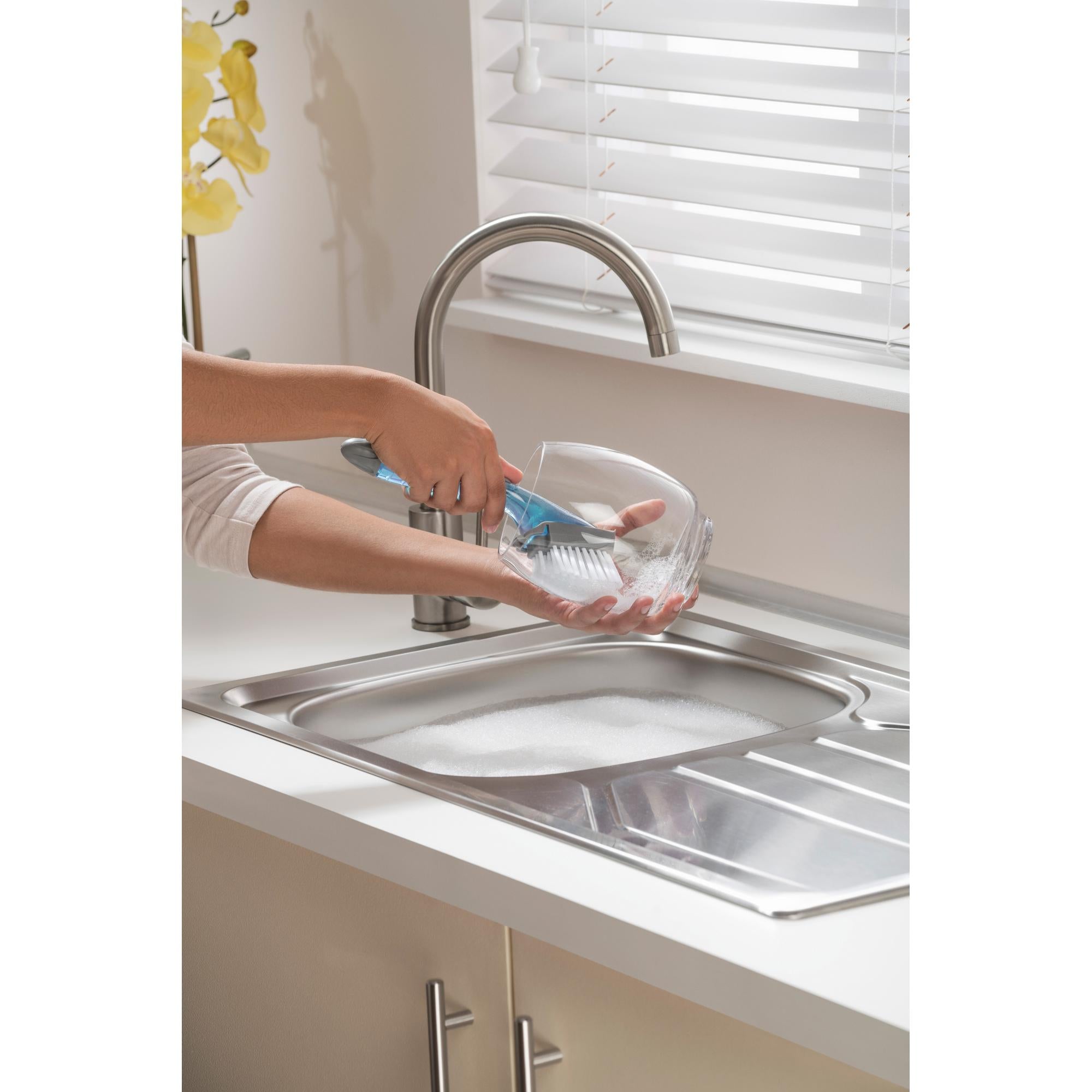 - Fill it up with your favorite dish soap and effortlessly wipe away grease and grime