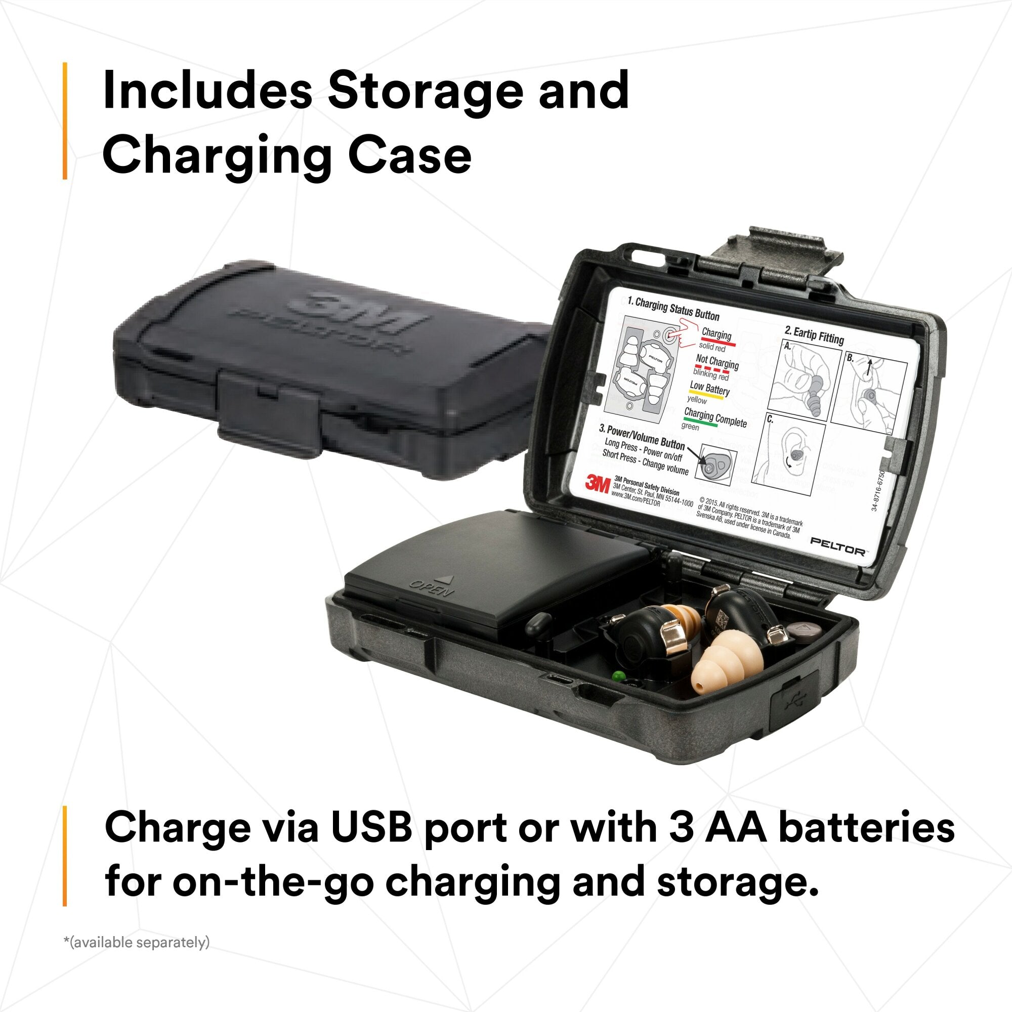 • The ear pieces are rechargeable via Micro USB or 3-AA Alkaline Batteries.