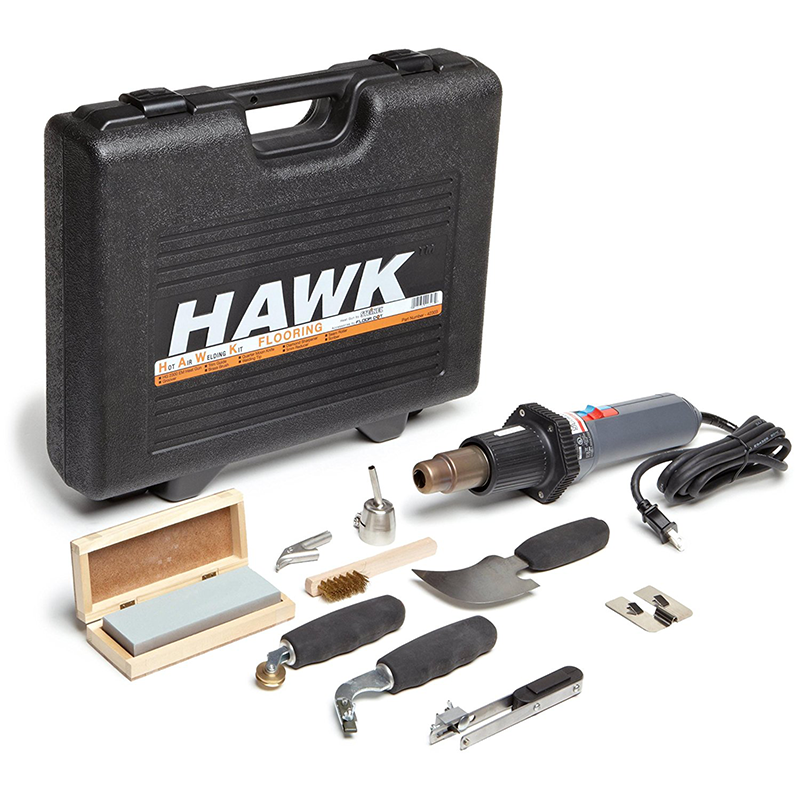 The Steinel 42303 HAWK flooring kit includes an HG 2300 EM heat gun, which emits airstreams at temperatures ranging from 80 to 1,100 degrees F up to 15.4 cubic feet per minute (CFM) at a pressure of 3,000 pascal. The gun’s temperature and airflow can be varied continuously with two slide switches. The straight form gun has a field-changeable heating element with a coil life of up to 500 hours and electronic thermocouple control to precisely regulate the output temperature. The HG 2300 EM has a sealed direct current (DC) brushless motor and a power cord that can be changed without opening the enclosure. The kit includes an assortment of flooring hand tools, sharpener, reducer nozzle, speed welding tip, and a heavy duty carrying case for safe transport and storage.