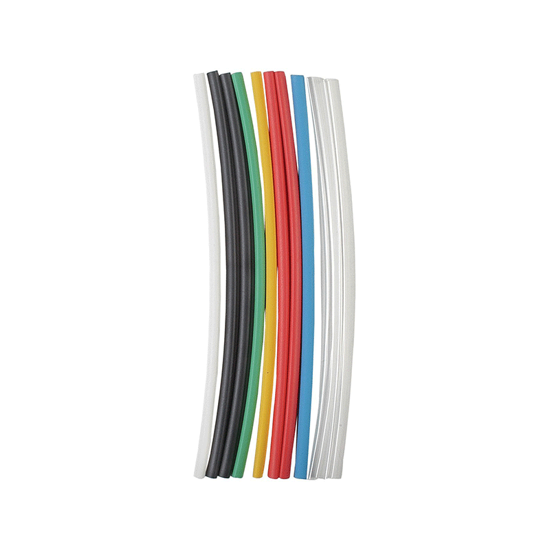 Each Package Contains: (2) Black, (2) Red, (2) Clear, (1) Green, (1) Blue, (1) Yellow, (1) White. It is a polyolefin based heat-shrinkable tubing with excellent electrical, chemical and physical properties. This tubing is used in commercial, industrial and military applications. It can provide strain relief, insulation, color coding, identification and protection against fluids.