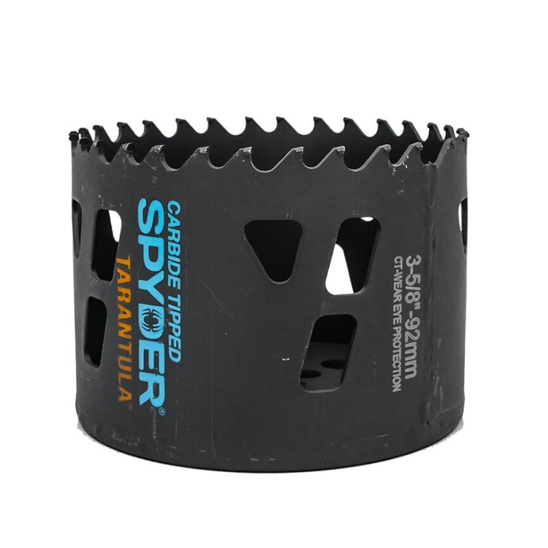 Spyder Tarantula carbide tipped hole saws - up to 50x more cuts and up to 10x faster when compared to conventional hole saws. Easily cut through nail embedded wood, steel, stainless steel, cement fiber board and more. The Rapid Core Eject arbor system makes core removal easy, saving you time and hassle.