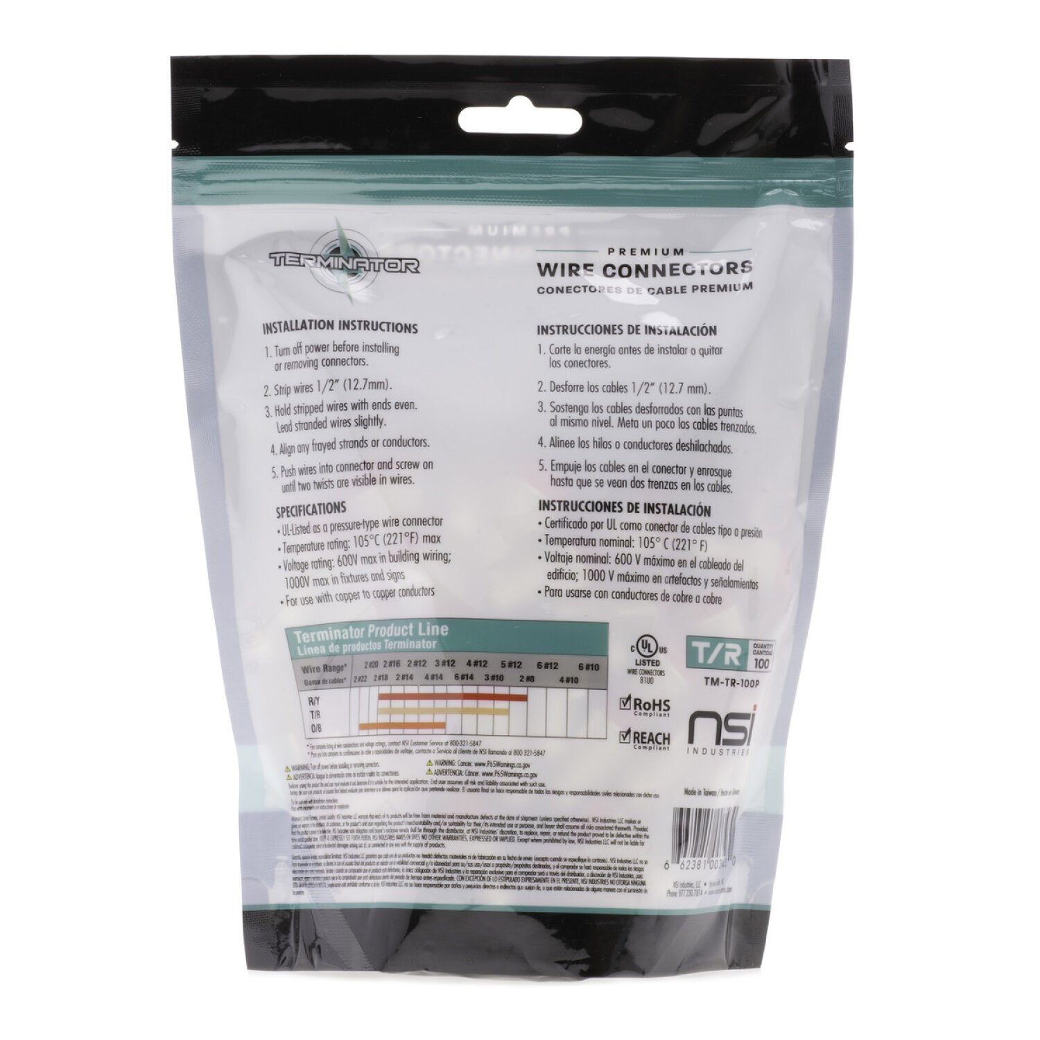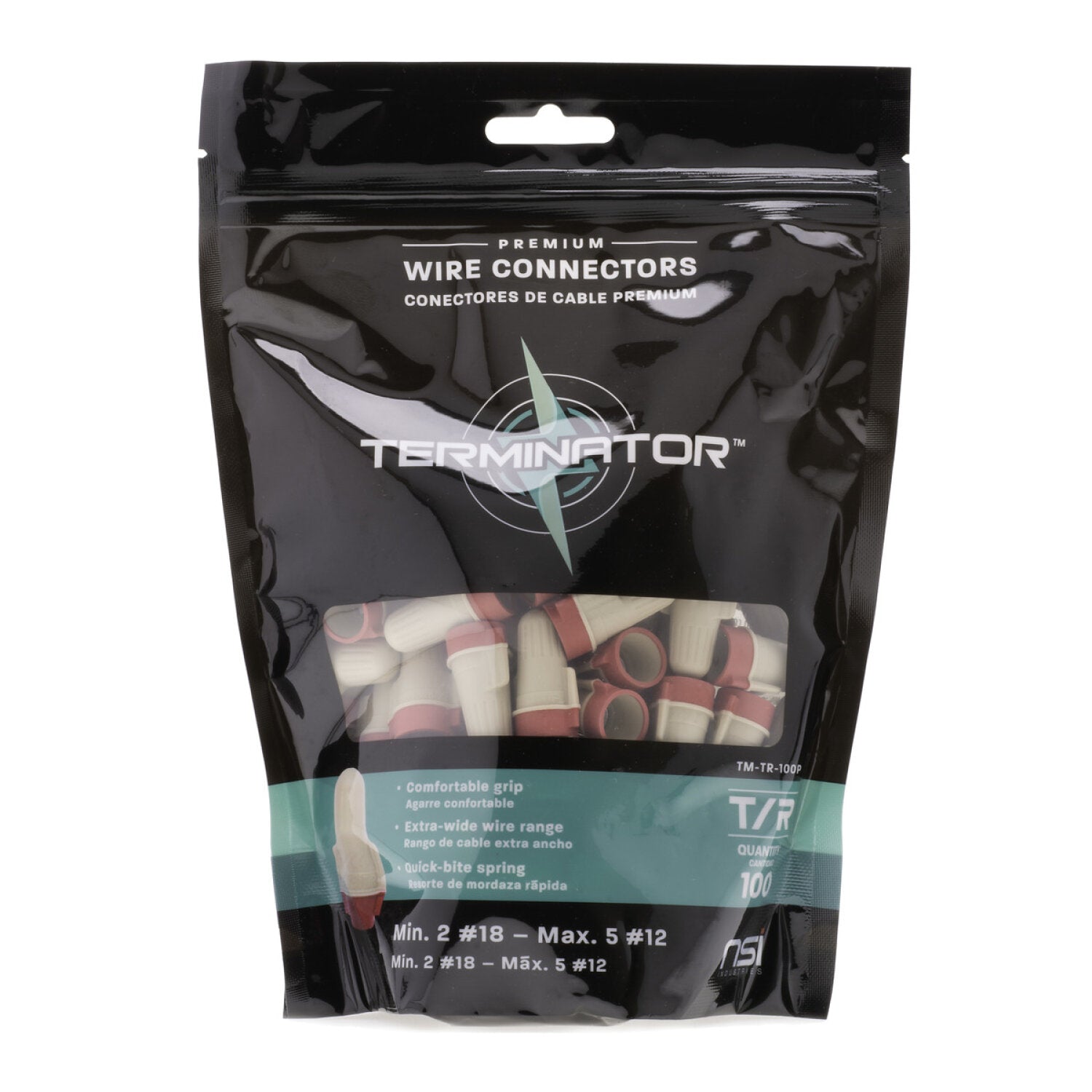 Extra-Wide Wire Range: TERMINATOR Tan/Red combines a flexible skirt and an expanding spring to fit a range of solid or stranded wires from 18-12 AWG