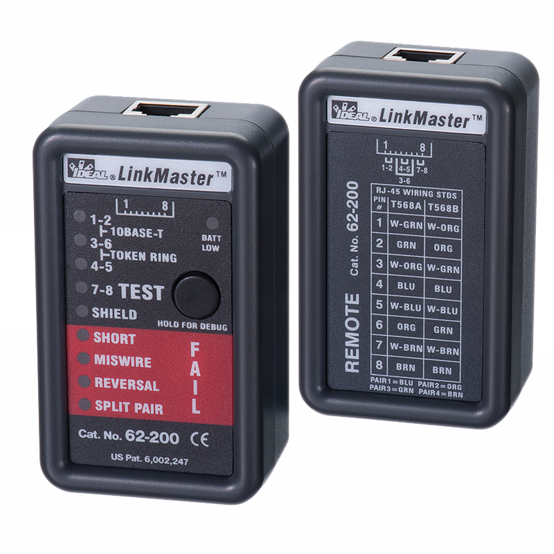 Debug feature cycles through each pair so the user can see the pass/fail status of each pair one at a time. Single button operation simplifies the use of the LinkMaster™. Includes main test unit and remote unit. Includes 4 1.5V LR44 batteries for main unit. Remote does not require batteries.