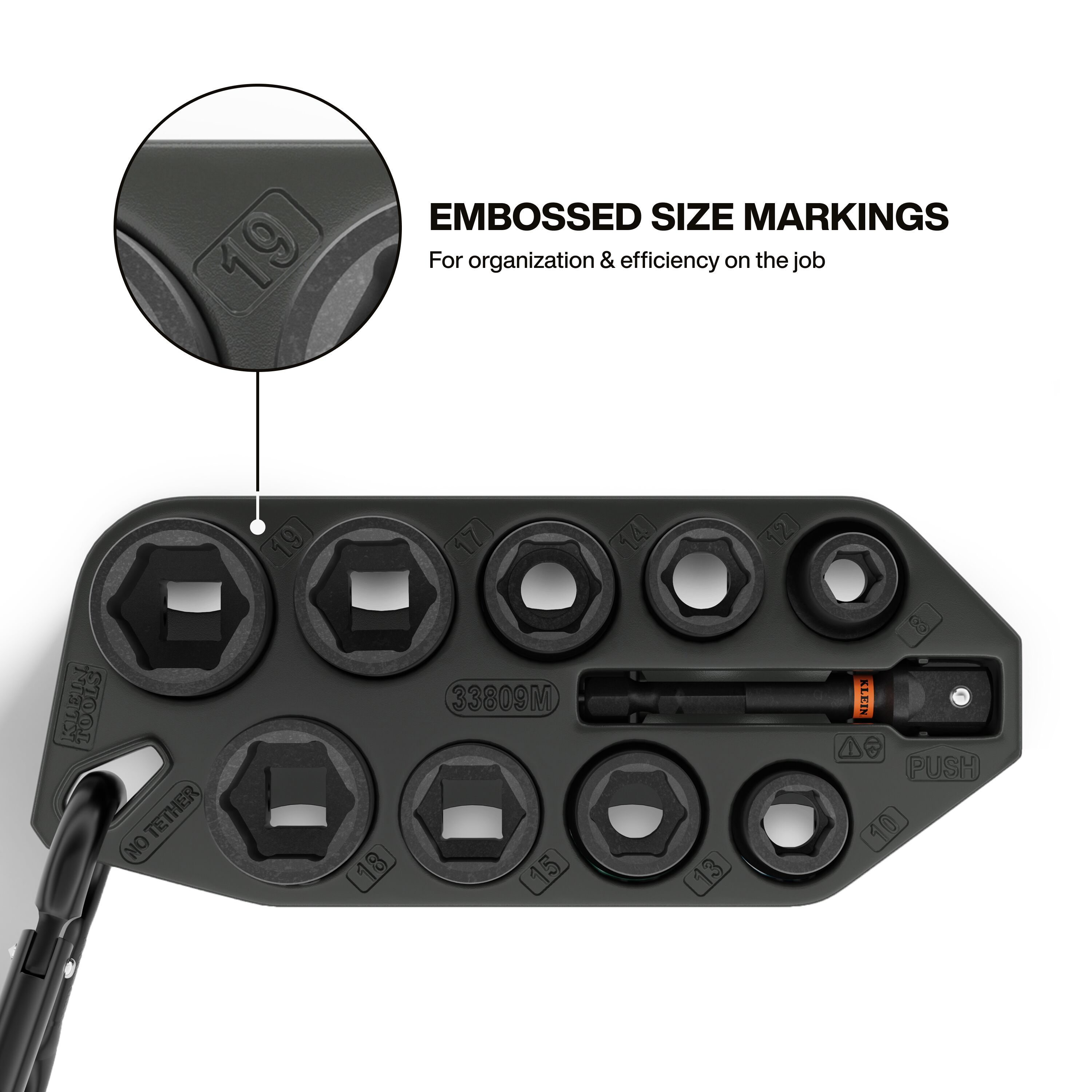 - Convenient carabiner attachment lets you secure the socket sleeve to backpacks, tool bags, or belts for instant access and improved job site productivity