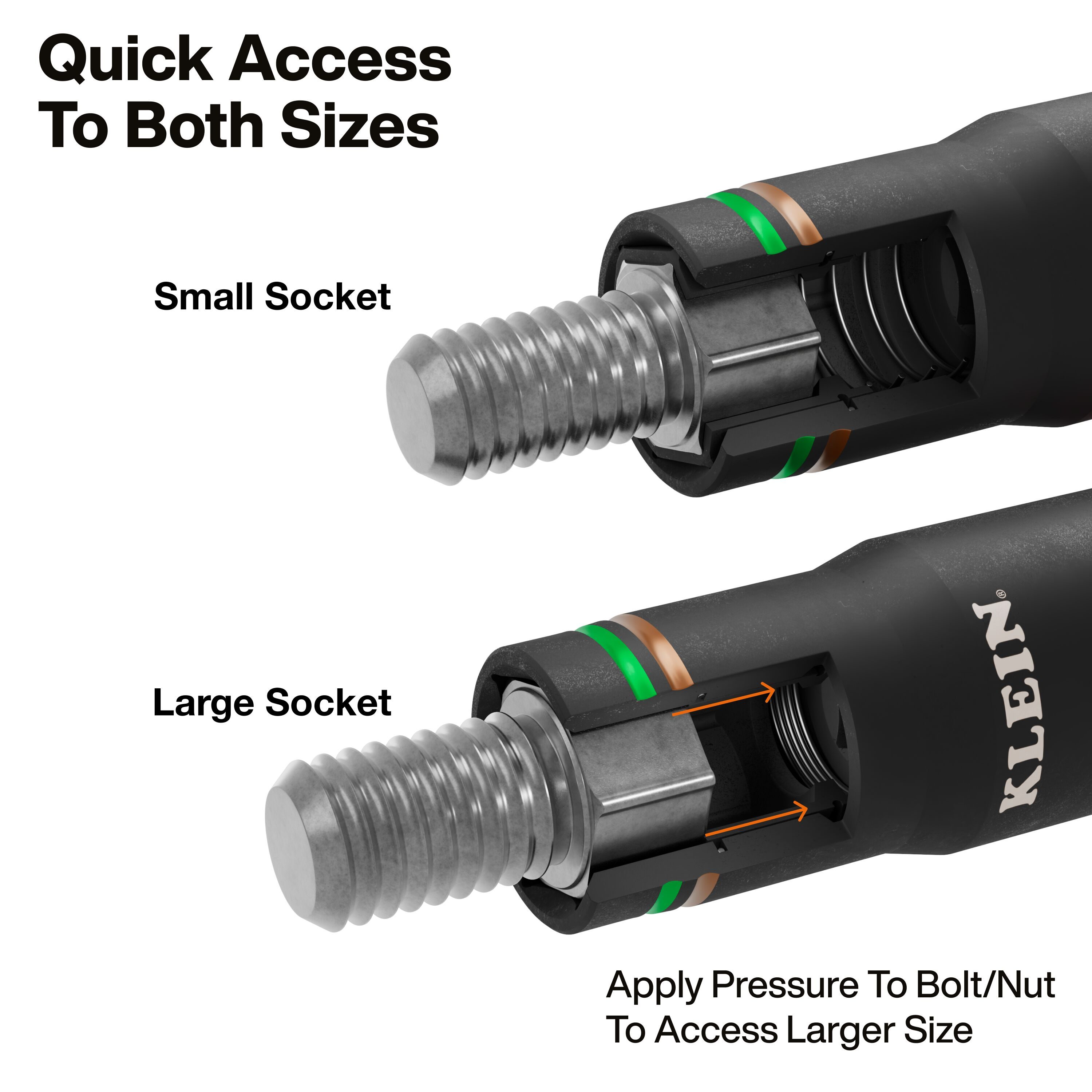 - Spring-loaded action allows hands-free access to either hex size by applying pressure to compress the smaller socket out of the way