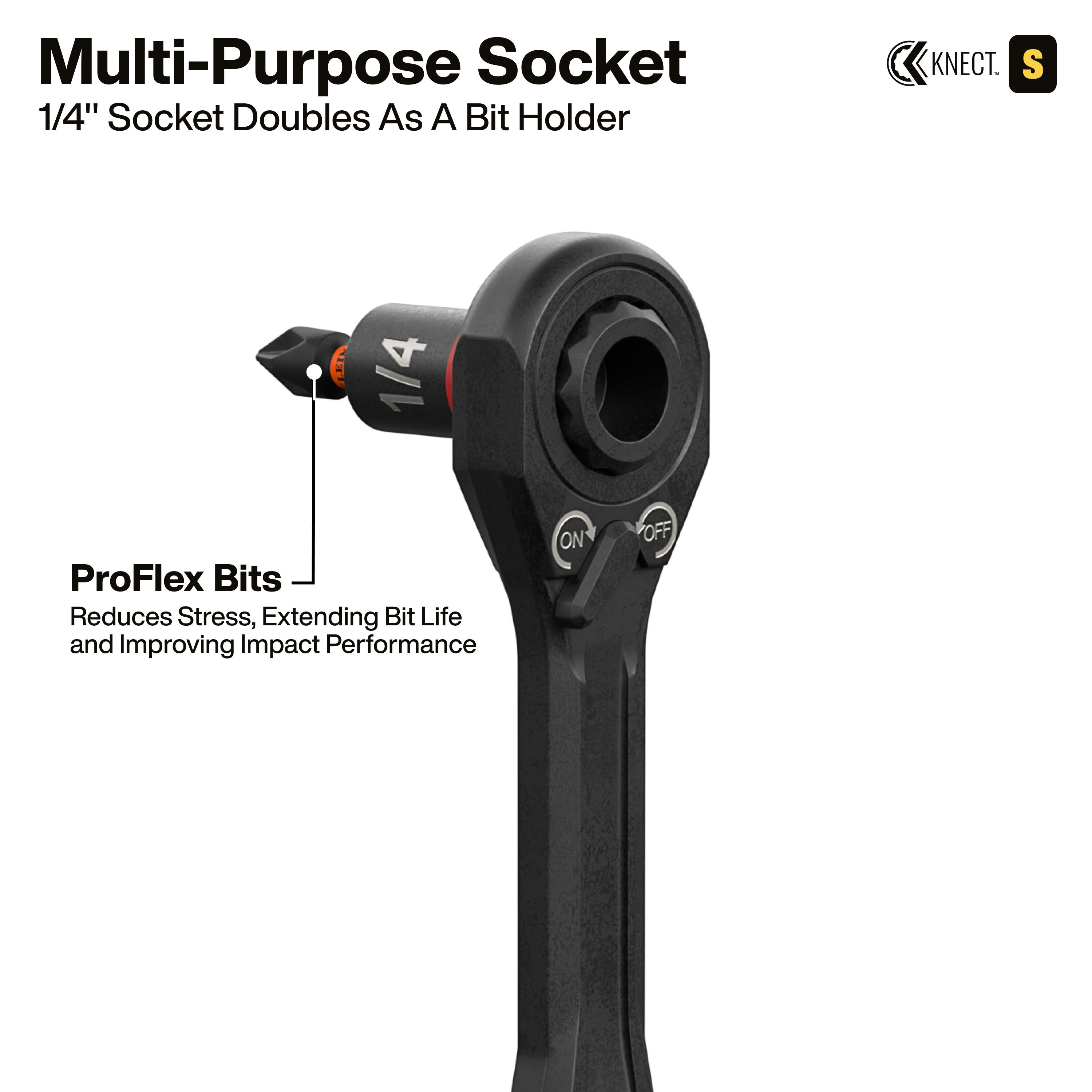 - Complete KNECT™ starter set includes six SAE sockets, three flip sockets, seven driver bits, and four adapters