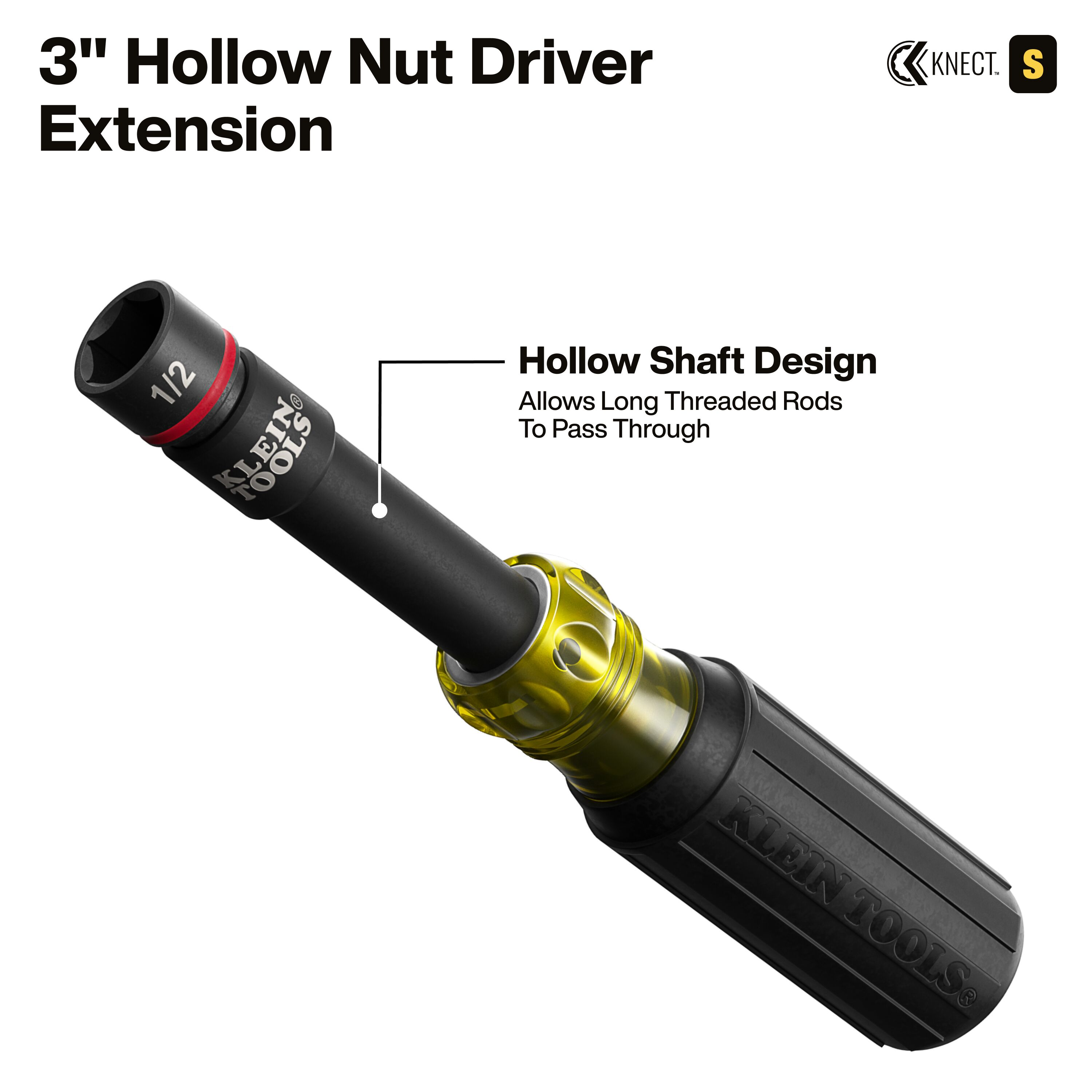 - Pass-through socket system with slim profile head drives hex nuts on extended threaded rods with superior access