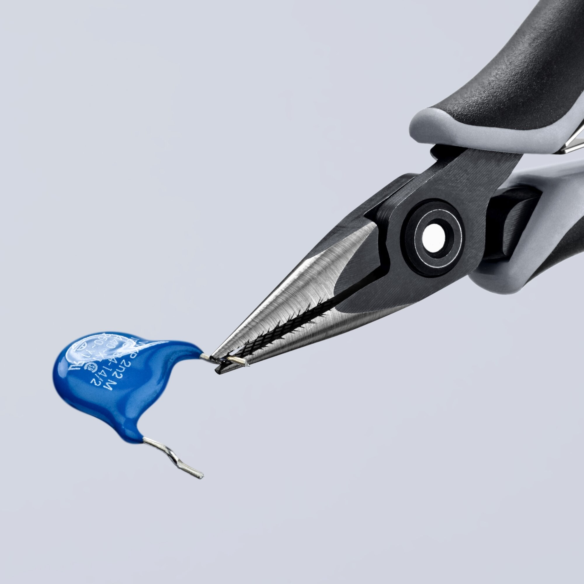 For very precise assembly work, e.g. in electronics and fine mechanics. Used for gripping, holding and bending. Smooth ground gripping surfaces. Approximately 20% lighter than conventional electronics pliers. Bolted joint and carefully manufactured joint surfaces for even, low-friction movement throughout the entire opening range. Double spring for a gentle and even opening. Multi-component grips for comfort when working on repetitive tasks. Half-round, cross-hatched jaws. ESD (electrostatic discharge) handles discharge electrostatic energy through the handles in a gradual and controlled manner which protects components endangered by electrostatic discharge. Chrome vanadium ball-bearing steel. Head polished. Handles with multi-component grips. Style: half-round jaws, with precision laser cut cross-shaping.
