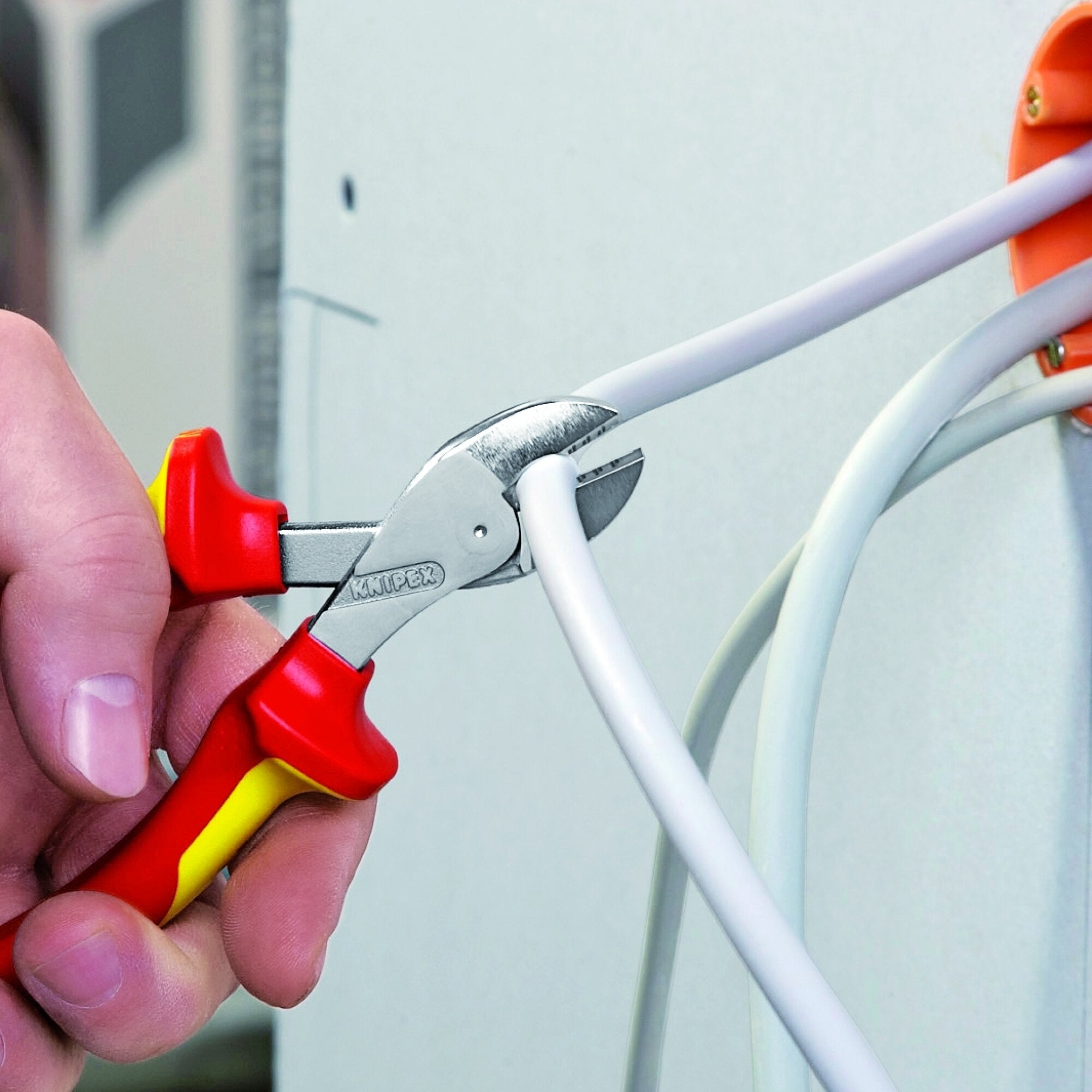 40% less effort required compared to diagonal cutters of the same length. Powerful, light weight and a universal cutter. Cuts fine strands as well as multi-stranded cables and piano wires. 1000V multi-component grips, VDE-tested. Box-joint design for highest stability and lightweight. High cutting performance with minimum effort due to optimum coordination of the cutting edge angle and transmission ratio. Large opening width for thicker cables. Cuts all wires precisely, even fine copper wires. Compact, low weight construction. Double supported joint axis for heavy-duty work. Universal usage in the assembly, maintenance and production. Cutting capacity - up to 3/16" for soft, up to 5/32" for medium, up to 7/64" for hard , up to 3/32" for piano wire and up to 15/32" for Cu and Al multi conductor cable. Chrome vanadium heavy-duty steel; forged, multi stage oil-hardened.