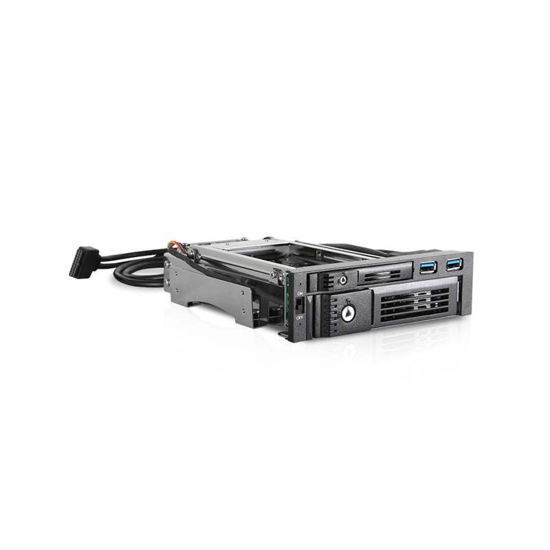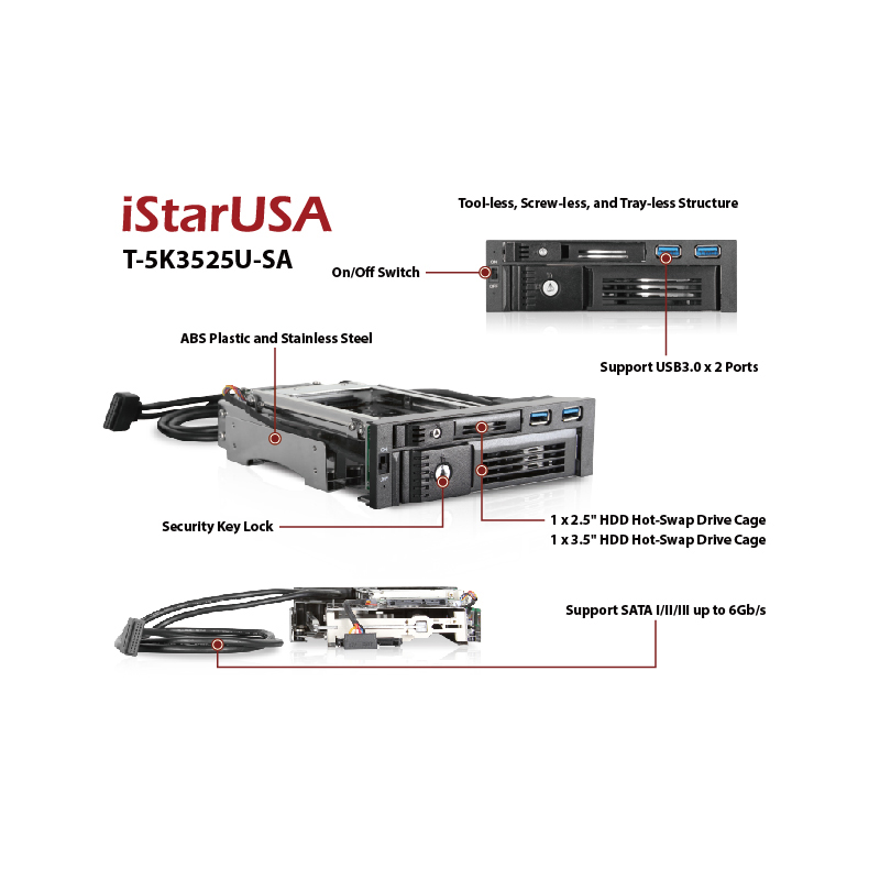 T-5K3525U-SA is a combo drive cage that takes a standard 5.25" drive space to give one 2.5" and one 3.5" hotswappable trayless SATA drive bay. Also, it supports two USB 3.0 ports in the front for easy access. This device provides flexibility to fully utilize your system chassis.