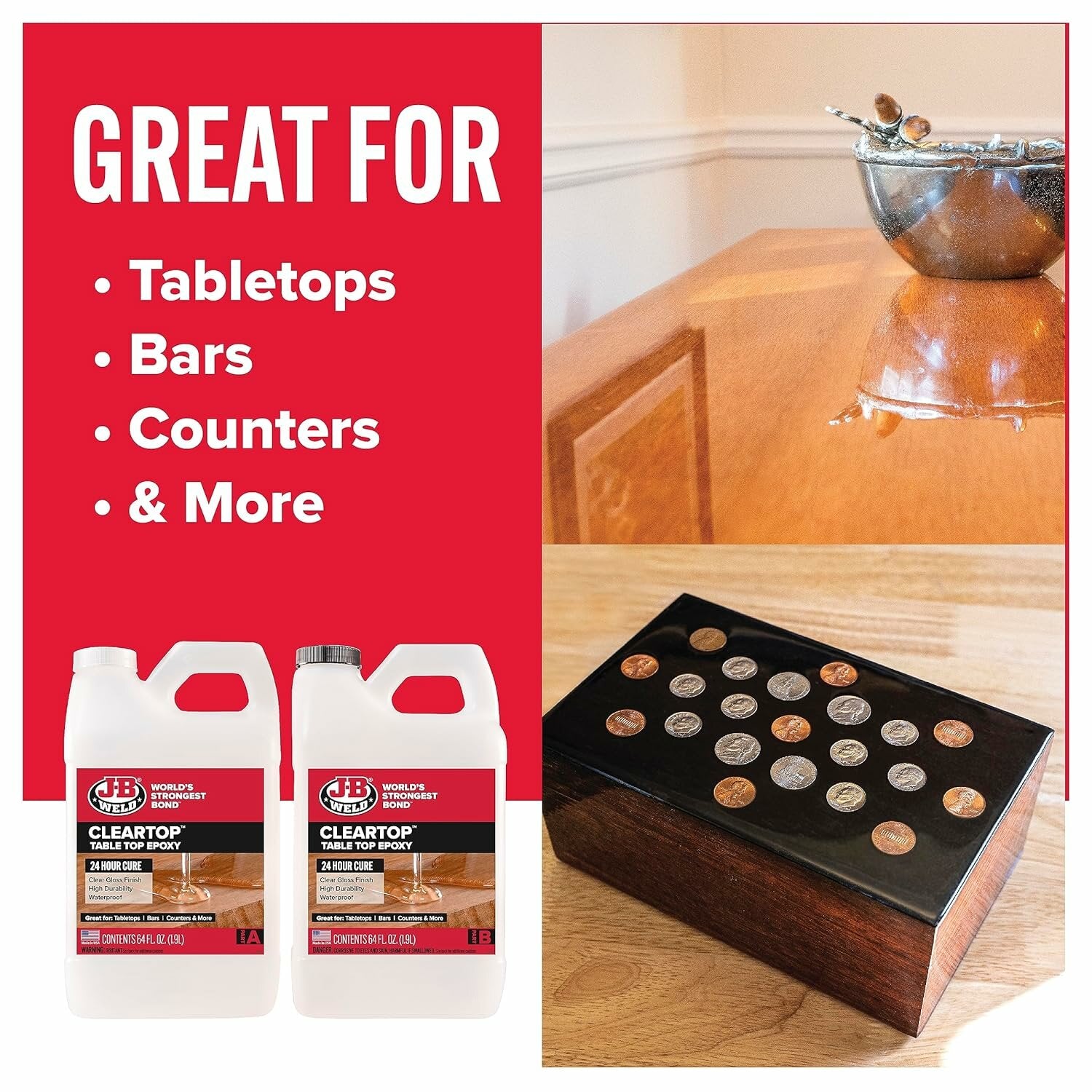 • J-B Weld ClearTop is a two-part pour-on epoxy that is specially formulated for coating projects on tables, bartops, and other surfaces
