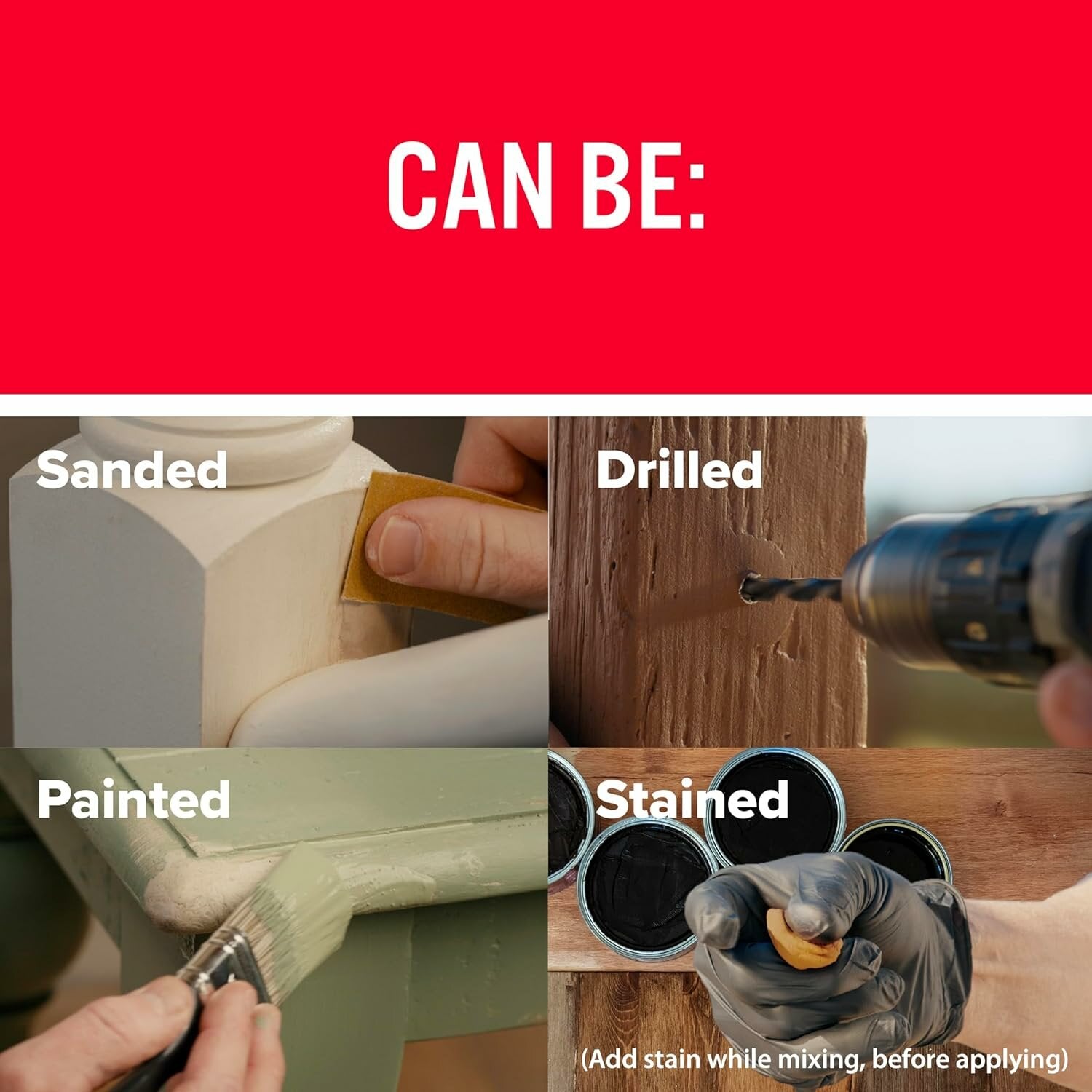 - After mixing, it cures to the same density as wood and becomes an integral part of the repair