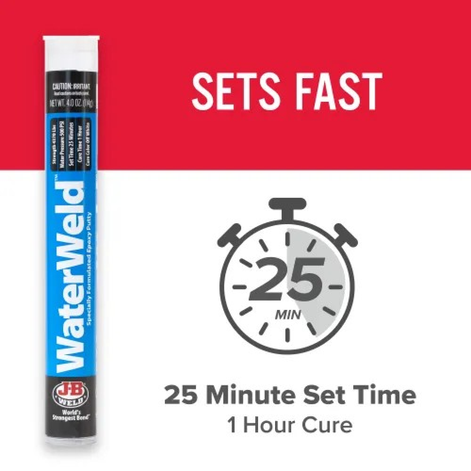 - WaterWeld has a set time of 15-25 minutes and sets hard in one hour