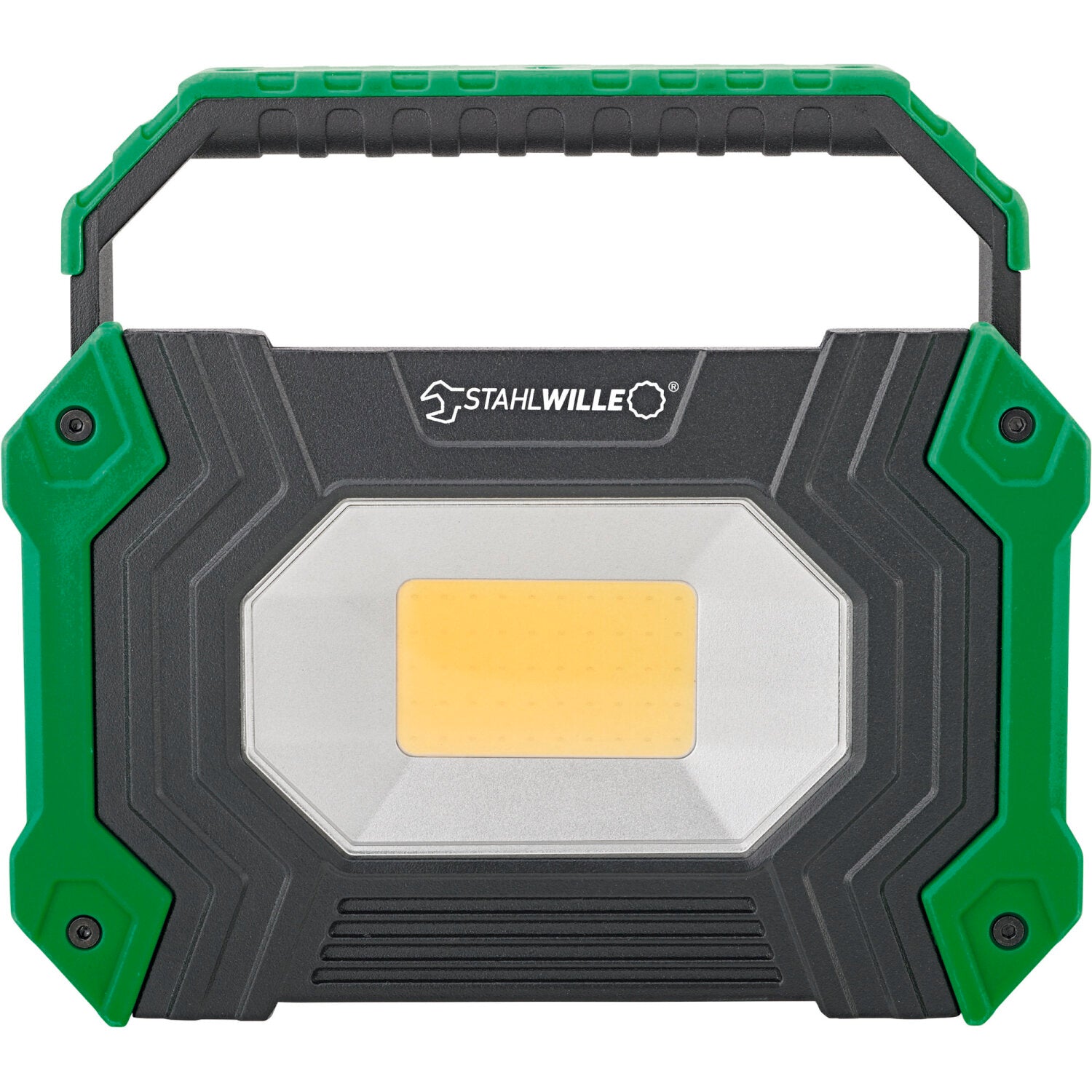 Cordless 30 W LED spotlight with magnetic holder for indoor and outdoor use.