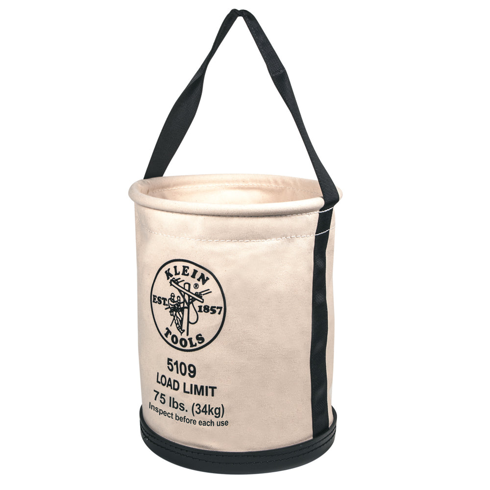 The Klein Tools 5109 6 Canvas Wide-Opening Straight-Wall Bucket has a 75 lb. Max Load Rating. Polypropylene-rope handle reinforced with leather for water resistance and strength. Durable, straight-wall and tapered-wall buckets are made of heavy-duty canvas. High-density polyethylene top ring for strength and chemical resistance. No. 6 canvas. The No. canvas refers to the canvas weight. No. 1 being the thickest and No. 8 being the thinnest. Black molded polypropylene bottom.
