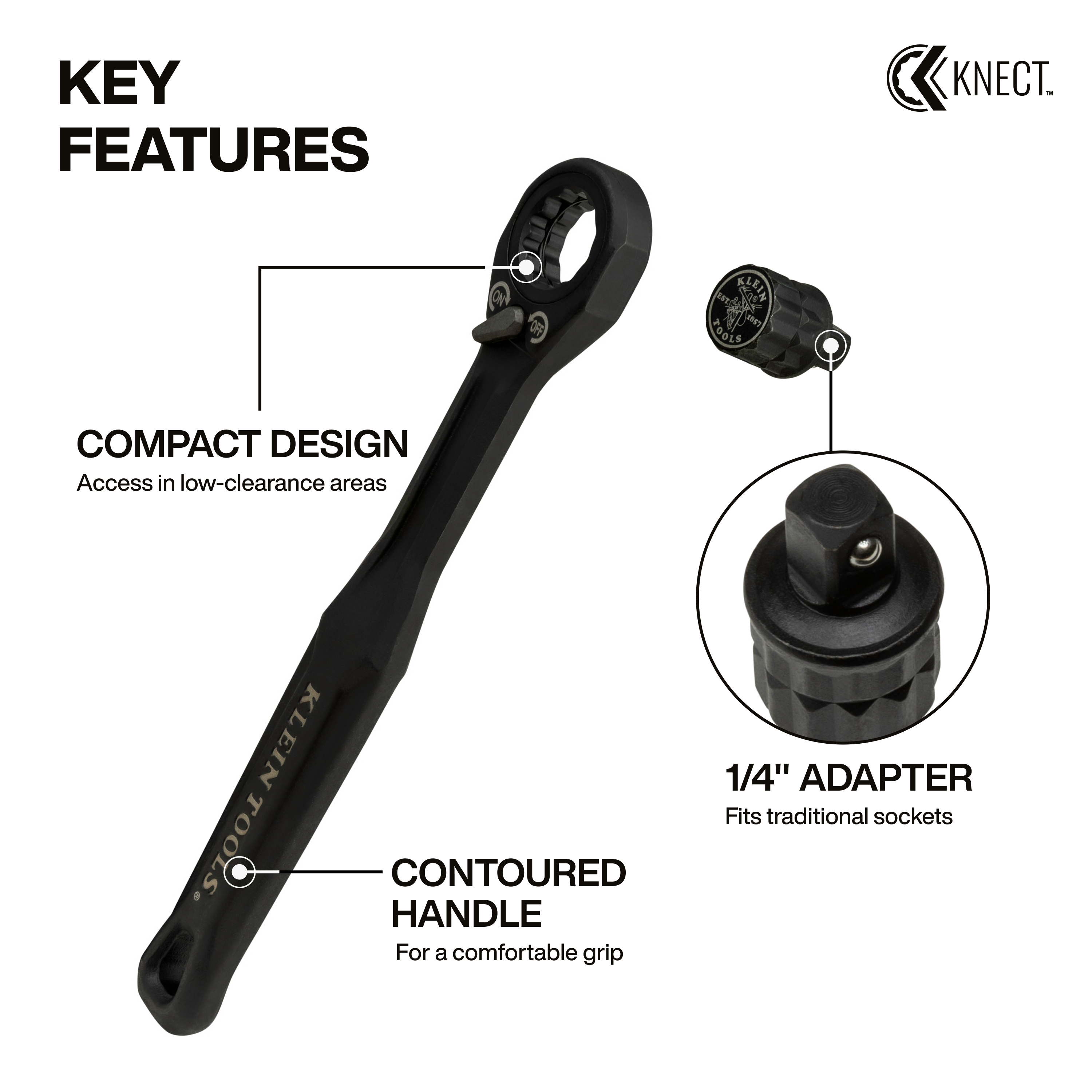 The KNECT (S) pass through ratchet is perfect for driving hex nuts on extended threaded rods. The included 1/4-Inch square drive adapter ensures compatibility with traditional sockets, making it a must-have for any toolbox. Its compact design allows easy access in tight spaces, while the contoured handle provides a comfortable grip.
