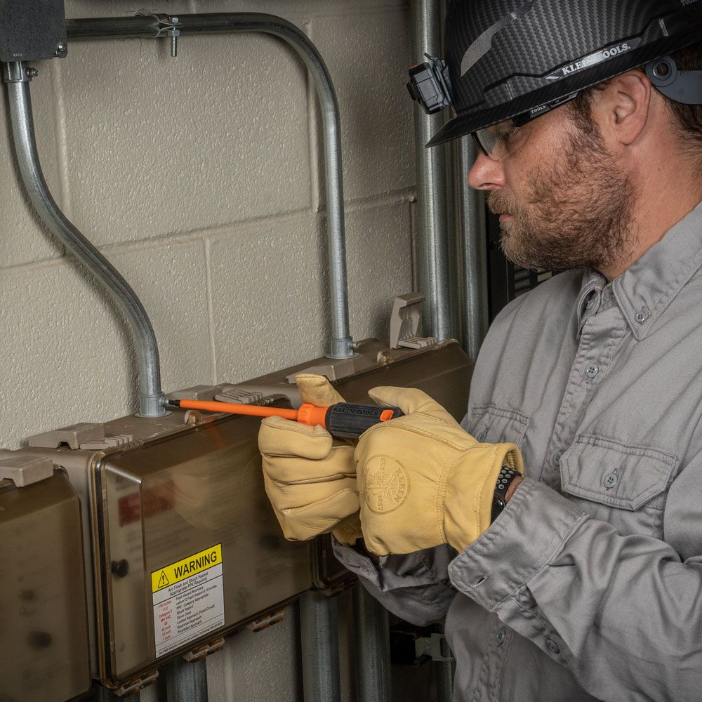 Klein Tools' Insulated Screwdrivers feature a bright orange coating of flame and impact resistant insulation to protect against electrical shock. These tools exceed the ASTM F1505 standards for insulated tools, and are clearly marked with the official 1000V rating symbol. The tether hole in the handle provides added safety when working at height. Available in 4-Inch and 6-Inch round shanks with a variety of tips.