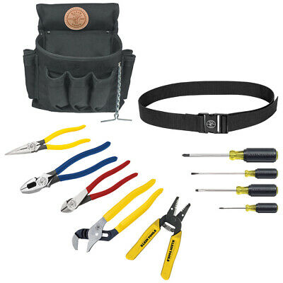 Set consists of two Phillips and two slotted drivers; lineman, long nose and water pump pliers; wire stripper, pouch and tool belt – plus a chain for electrical tape