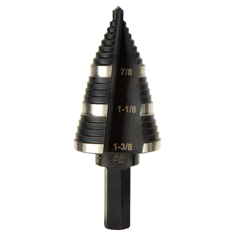 Step drillbits feature flutes for fast cuts, a 3/8” hex shank for solid grip, easy to see targets, and a tip that is non-walking