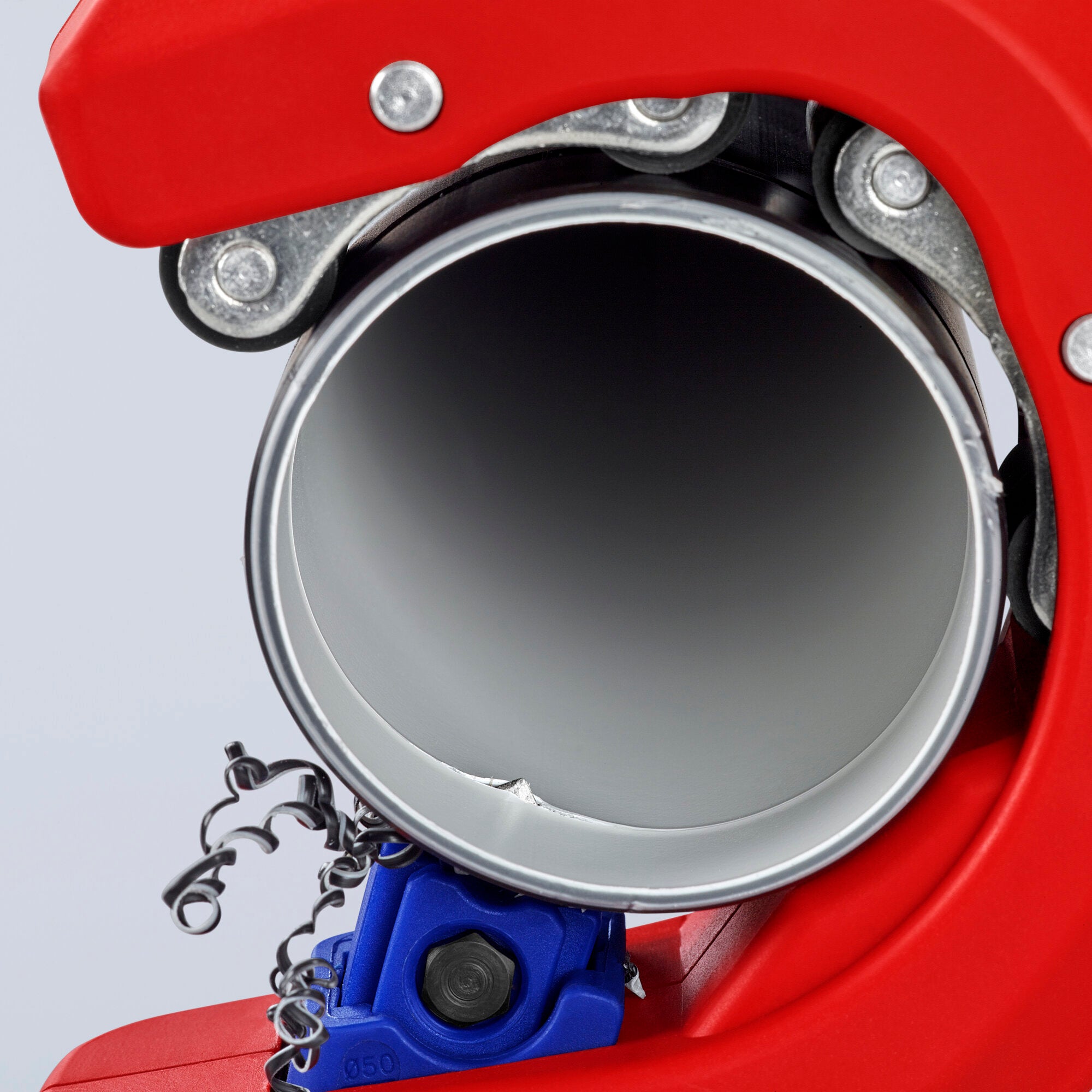One tool that cuts and chamfers all common European drain pipe with diameters of 32, 40 and 50 mm. Reversible high-quality ball-bearing steel blade, can be easily replaced without tools. Provides a clean cut without the need to readjust or deburr the cut end of the pipe. Cuts high temperature and other plastic pipes with wall thicknesses up to 2.4 mm. Optimal cutting due to slide-bearing and self-adjusting guide rollers. Easy positioning due to clear view of cutting point. The blade is spring loaded so there is no need to readjust during cutting. Cuts lengths as small as 10 mm. Durable housing made of glass fiber reinforced plastic. Not designed for thick wall PVC pipes.
