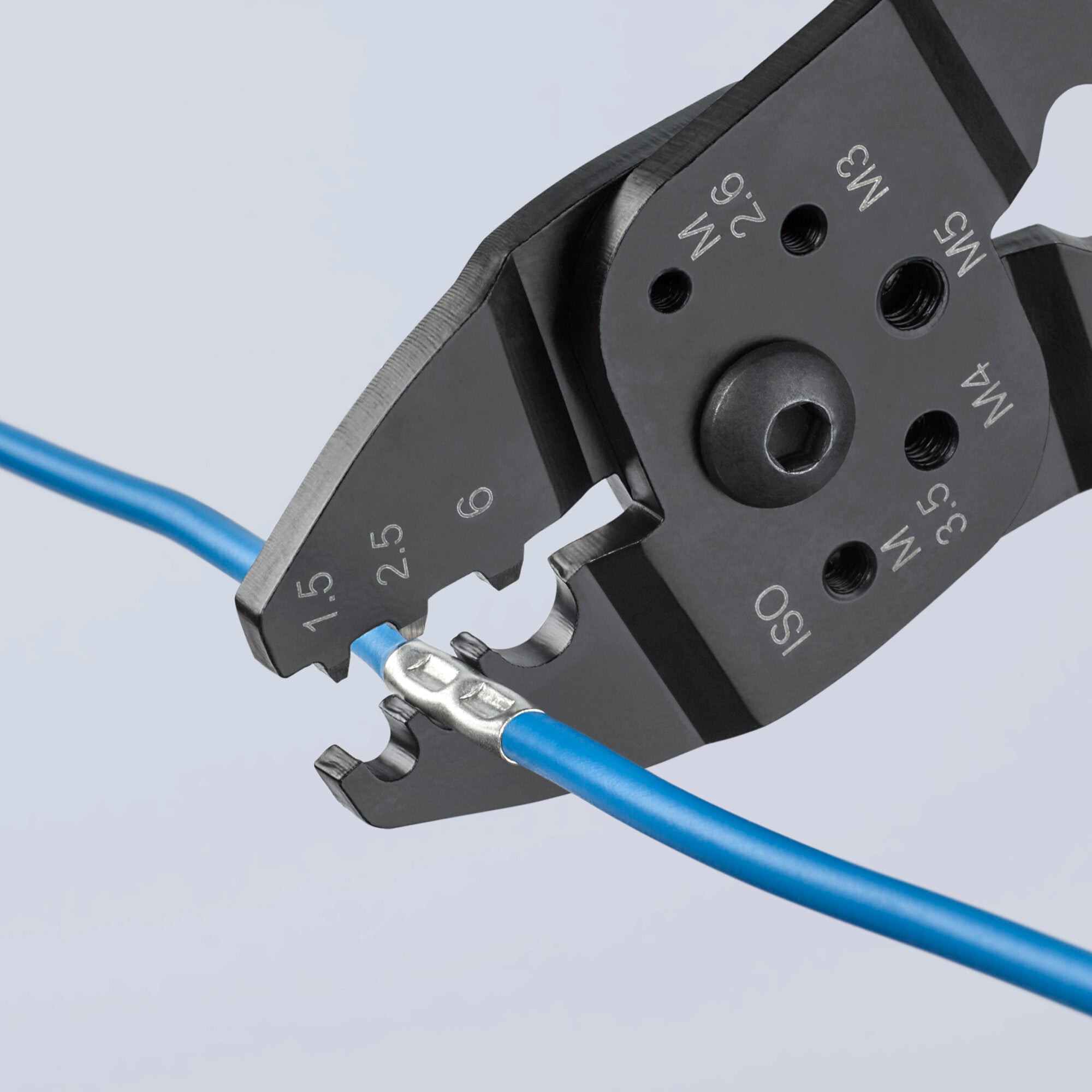 For cutting cables, stripping wire and crimping insulated terminals and cable connectors. With threaded holes for cutting copper and brass screws threaded 7/64", 1/8", 9/64", 5/32" and 13/64" (M2.6, M3, M3.5, M4 and M5). Bolted joint for higher stability and smooth movement. Made of special tool steel, oil-hardened.