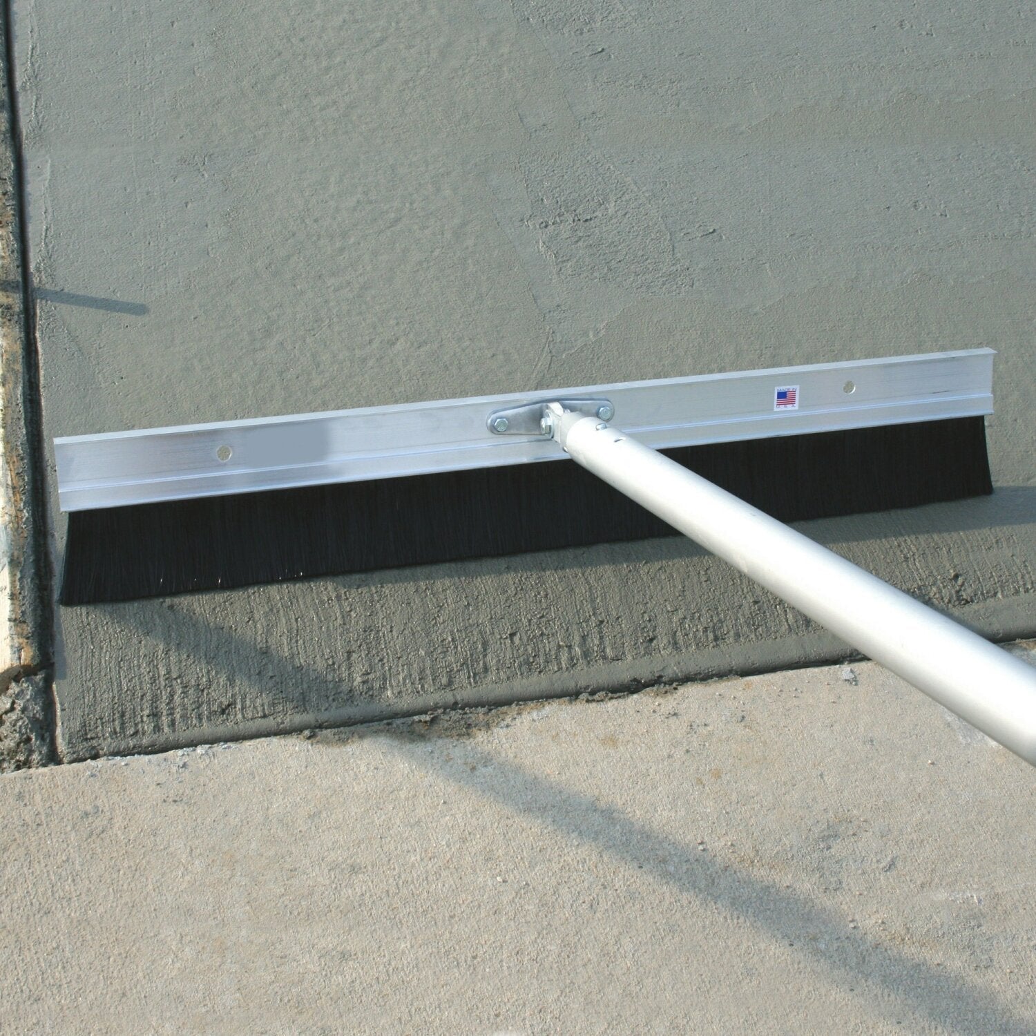 Brush down new concrete after floating with this lightweight aluminum broom. Popular for finishing sidewalks and driveways or wherever a finish with some traction is desired. The 3-1/8" medium/general purpose black poly bristles are epoxy set for long wear and durability. The 24" extruded aluminum provides a sturdy long-wearing base for the bristles. A clevis handle bracket is included and attaches to the broom. Use it with clevis style handles, or attach a threaded or button bull float handle adapter for more versatility and a longer reach across the cement slab. Add Kraft Tool's Flipper Tilt Bracket (CC496) can be attached to maximize your range of motion, sold separately. Hang holes along the top provide easy storage for your broom.