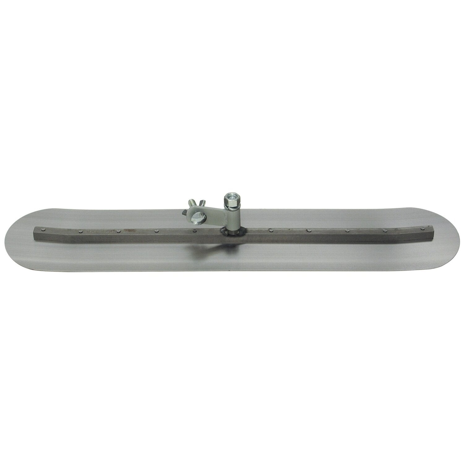 Extra tough fresno for working in rough gunite and shotcrete material. A 24" high quality carbon blade on a steel mounting to the same high quality specifications of the typical Kraft Tool Co.® fresno. The 21" square mounting extends the length of the blade to provide reinforced support of the 5" wide blade. The rivets on the mounting are left unground for additional strength in rough material. The rounded ends are raised to prevent scoring of the surface. Swivel bracket rotates 360° and can be locked into any angle. Use with clevis handles (sold separately). Use with handle adapters for use with bull float extension handles.