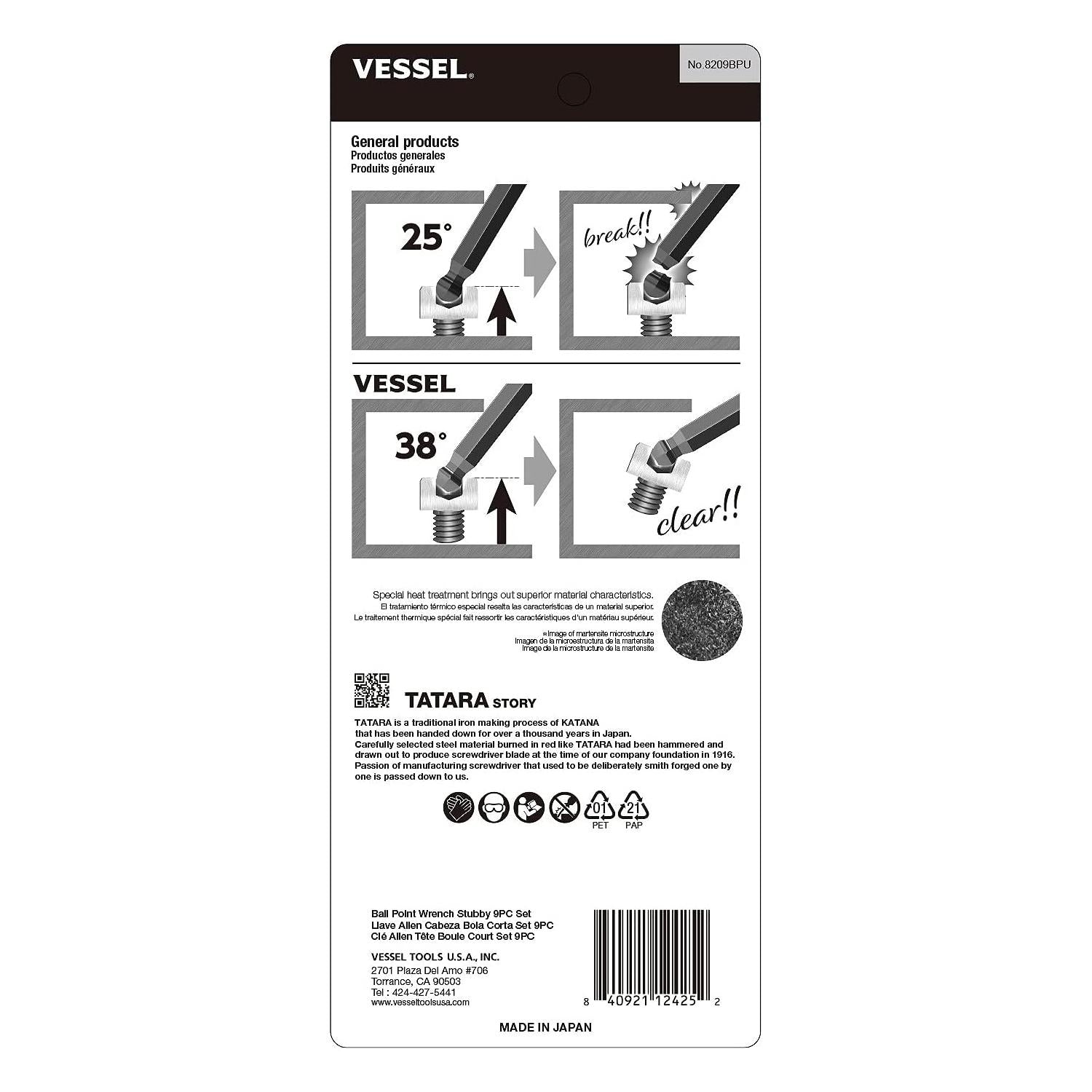 Vessel Tools 8209BPU Ball Point Hex L-Key Wrench Stubby 9 Piece Set