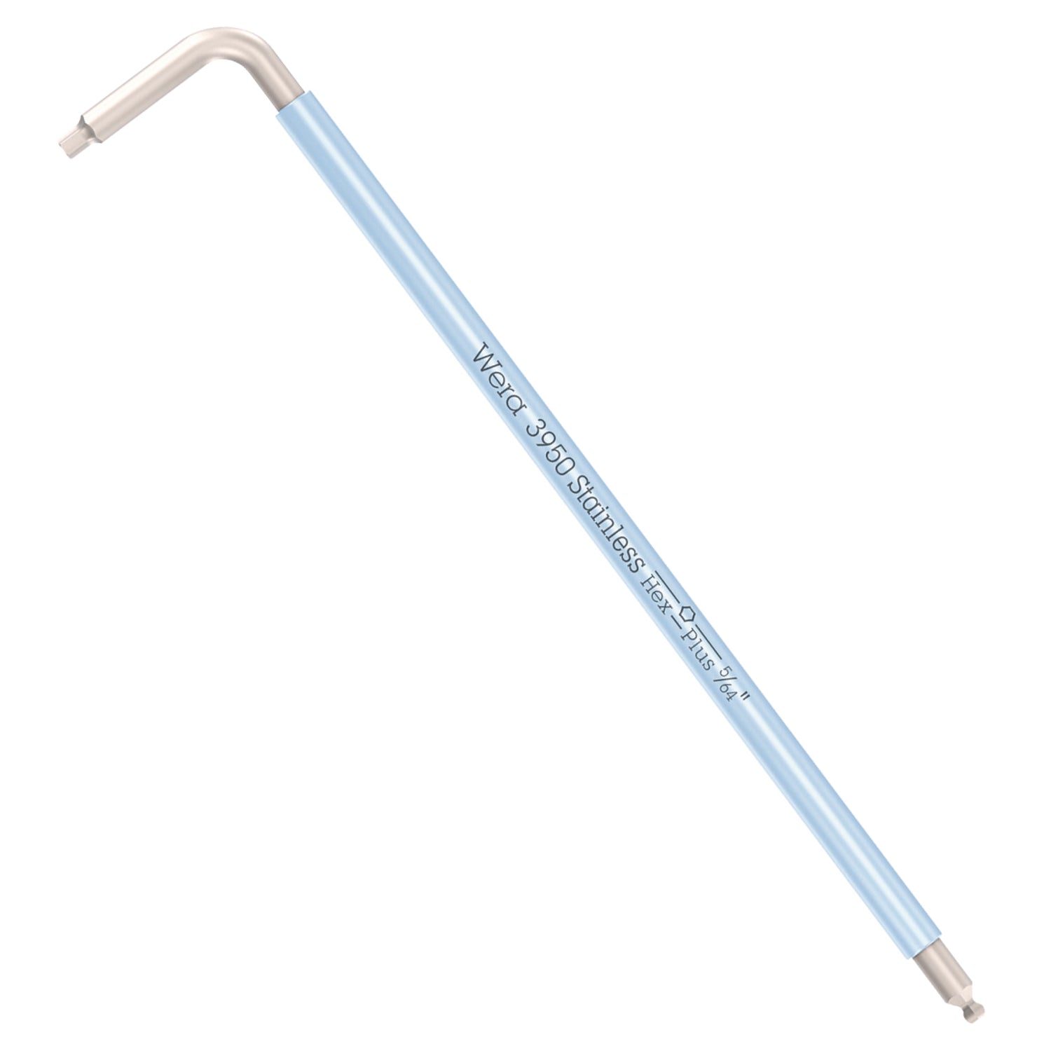 Premium L-key made of stainless steel for imperial hexagonal socket screws by Wera. Stainless steel prevents transmission of extraneous rust. The Hex-Plus profile offers larger contact surfaces in the screw head. The notch effect is reduced to a minimum and the destruction of the screw head is almost eliminated. With hexagonal ball tip at the long arm: The ball-shaped tip profiles enable the tool shaft to be moved and pivoted relative to the screw axis which allows screwdriving "around the corner". Take it easy tool finder with colour coding by size.