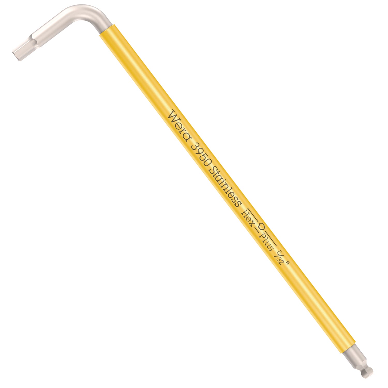 Premium L-key made of stainless steel for imperial hexagonal socket screws by Wera. Stainless steel prevents transmission of extraneous rust. The Hex-Plus profile offers larger contact surfaces in the screw head. The notch effect is reduced to a minimum and the destruction of the screw head is almost eliminated. With hexagonal ball tip at the long arm: The ball-shaped tip profiles enable the tool shaft to be moved and pivoted relative to the screw axis which allows screwdriving "around the corner". Take it easy tool finder with colour coding by size.