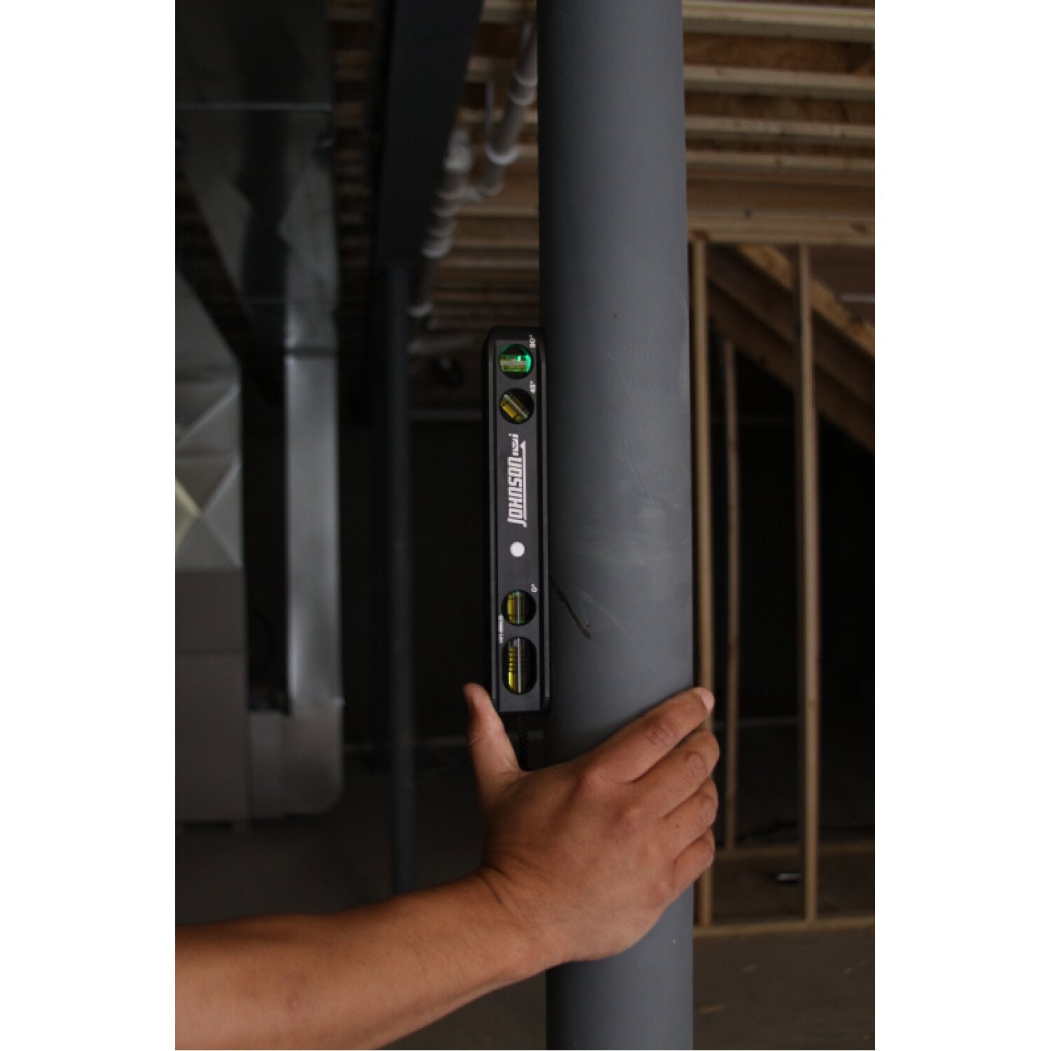 Johnson's easy to use LED billet level simplifies leveling by automatically illuminating the vial you need as you rotate the level. With a CNC machined aluminum frame and four crystal clear vials including a pitch vial, this level is highly accurate and durable, making it ideal for electricians, plumbers and HVAC contractors. Its powerful GripTight rare earth magnets hold to flat or round ferrous metal surfaces for convenient hands-free use. This level also includes machined vial openings for an accurate reading every time.