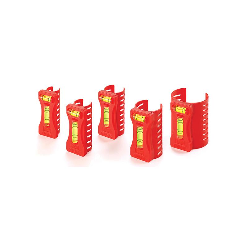 The Kapro 350 Pipe Level Set includes 5 level sizes. Each level has a horizontal and vertical cylindrical vial and a flexible, molded ABS body. They are also spring-loaded for easy clip-on attachment to standard sized metal and plastic pipes or posts.