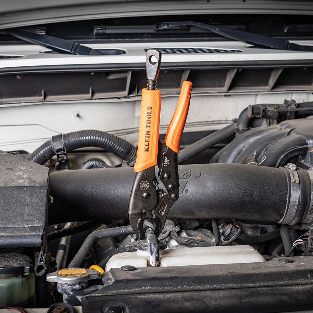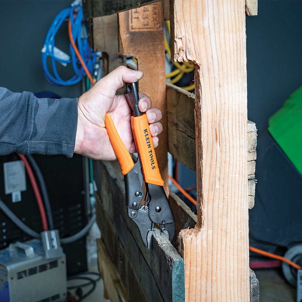 The Klein Tools' Locking Pliers Set including the 6-Inch Long Nose Locking Pliers (Cat. No. 38611), the 7-Inch Curved Jaw Locking Pliers (Cat. No. 38601), and the 10-Inch Curved Jaw Locking Pliers (Cat. No. 38602) are engineered for maximum locking force and designed for clamping, turning round objects, and working in confined areas. The intuitive thumb knob enables quick and easy size adjustments.