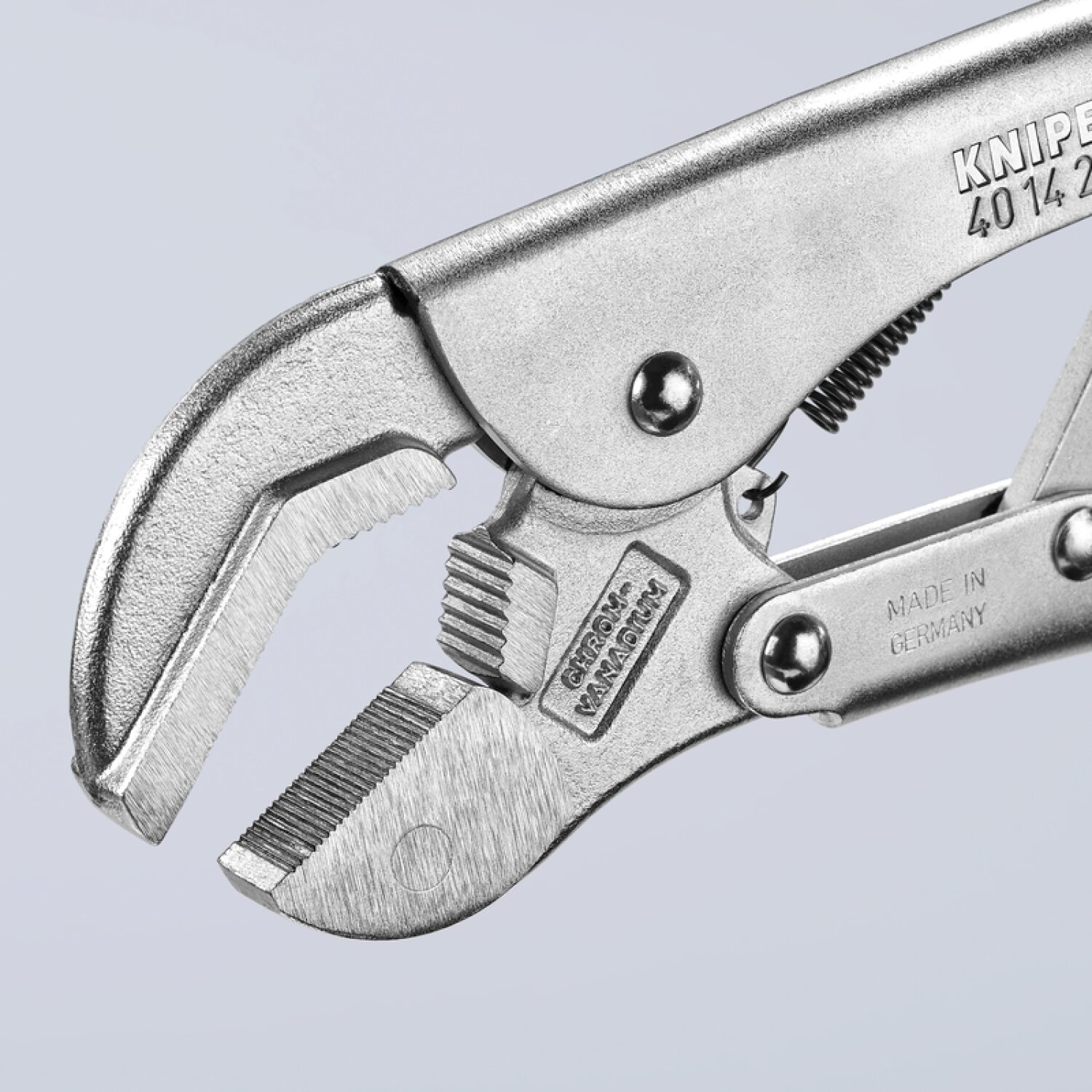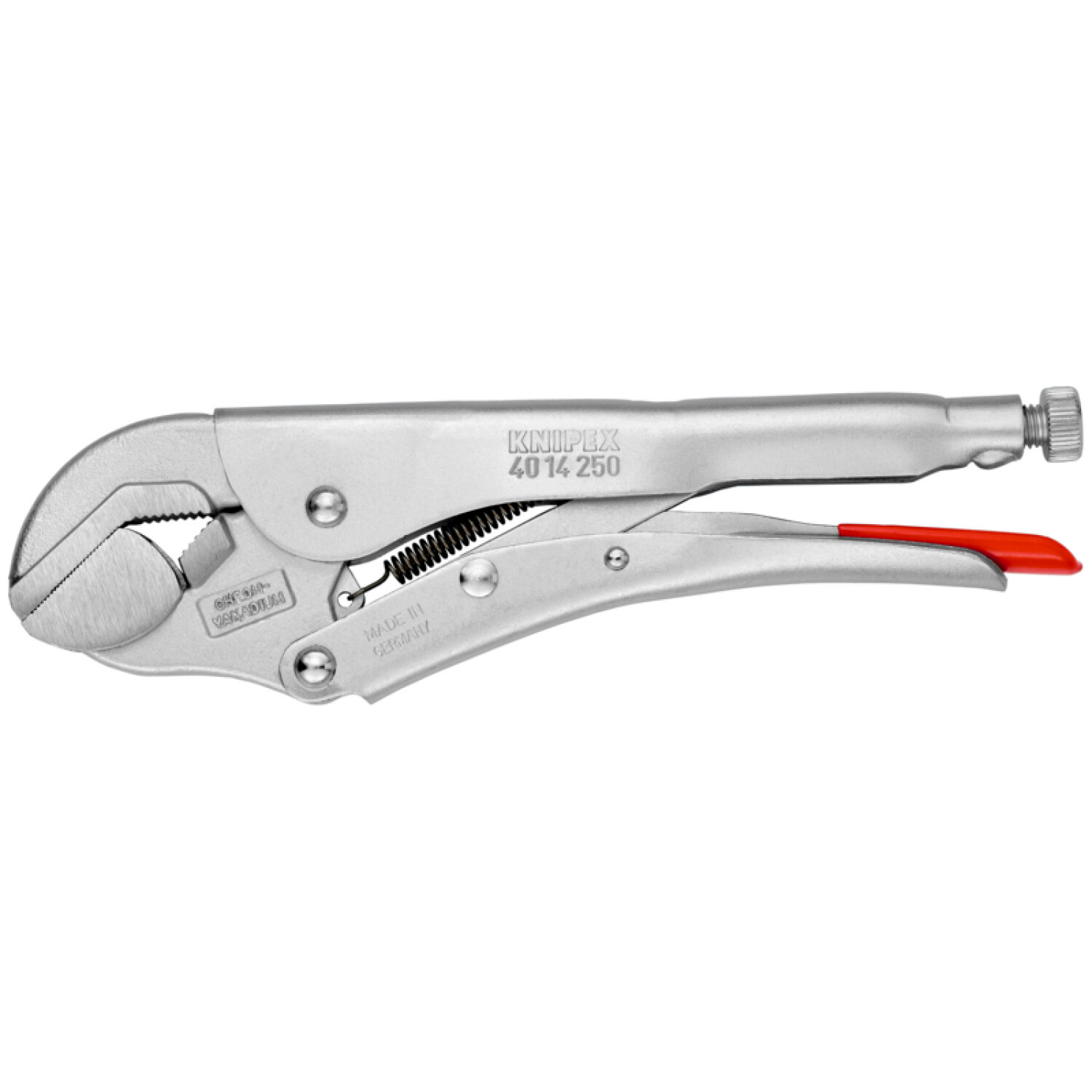 Universal Grip Pliers-Pivoting Jaw Tightly holds round or flat material. Heavy-duty tool for long life. Adjustment screw and release lever for easy use. Perfect for one-handed operation. High clamping pressure due to toggle lever action. Jaw capacity - up to 1 11/16" for round material, up to 1 5/8" for square stock and up to 1 3/4" for hex. Pivoting bottom jaw that automatically adjusts to the workpiece no matter the shape; round, square, hex or flat. Pliers body rolled steel, high-strength. Gripping jaws chrome vanadium electric steel; forged.