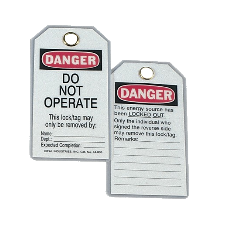 IDEAL Heavy-Duty Lockout Tags are laminated plastic tags that have non-fade legends, and resist corrosive and harsh environmental conditions grommet. They have high-visibility lettering, and the matte finish provides an easy surface for writing. Also comes with fastener.