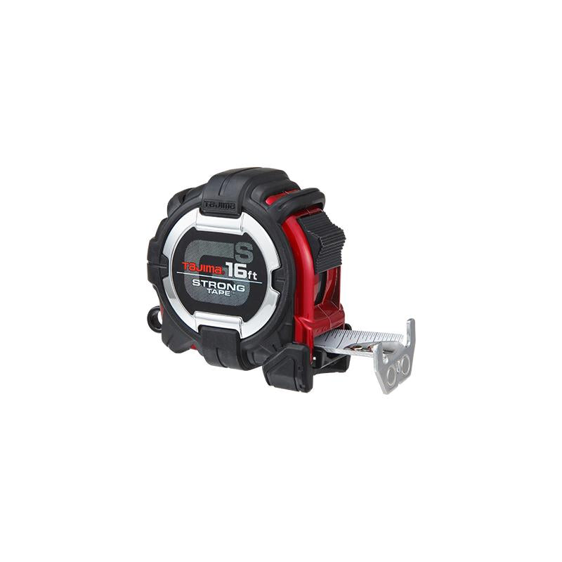 GS-LOCK, 16ft x 1in strong tape & HORNED MAGNETICNETIC HOOK with COMPATIBLE CLIP. Compatible clip is newly designed to allow for TAJIMA Safely Belt Holder. Extra-thick steel gererates more stiffness than 1 in (25 mm) standard tape measures. Thick elastomer case armor extends around the body of the tape measure to protect end hooks and work surfaces. Neodymium MAGNETIC Hook.
